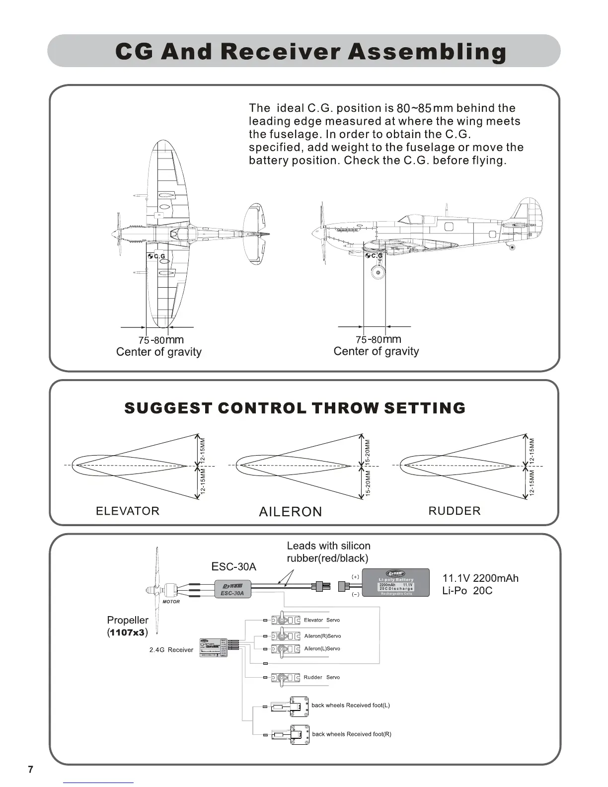 Dynam Spitfire - CG and Control Settings; CG and Receiver Assembling; Suggested Control Throw Settings