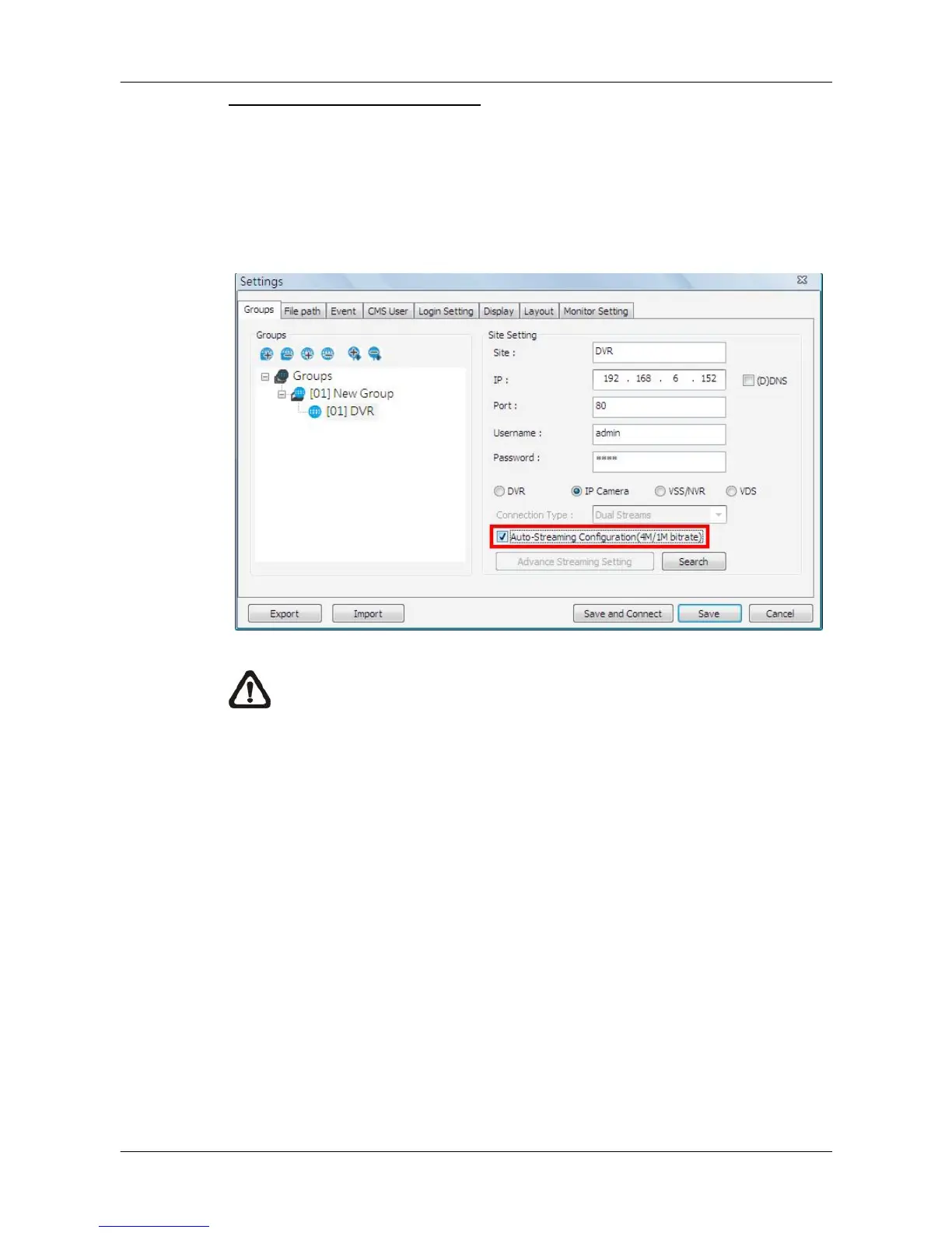 <Auto-Streaming Configuration(4M/1M bitrate)>. CMS will logon to the IP