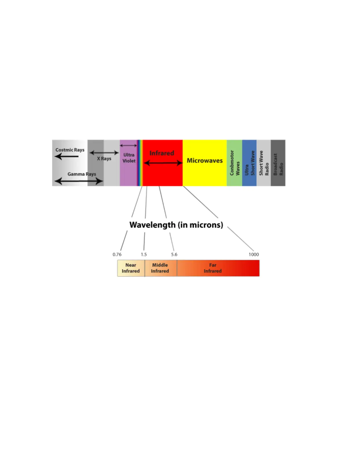 Infrared – 0.76-1.5 microns; Middle Infrared – 1.5-5.6 microns; and Far Infrared – 5.6-1000