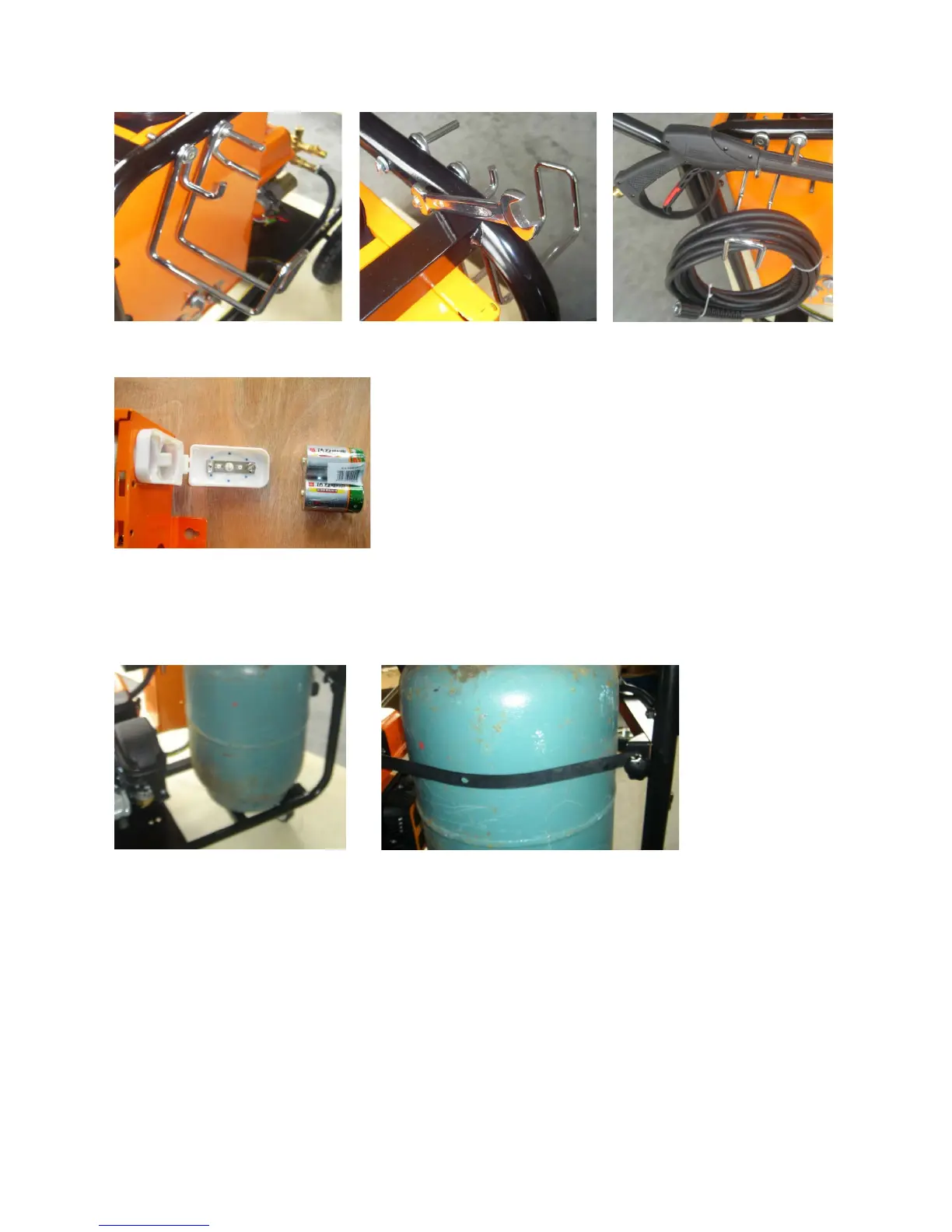 Place tank on the frame next to engine and LPG heater. Place belt behind vertical bar at frame