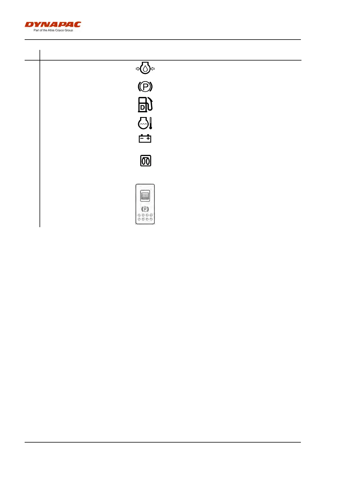 31. Parking brake On/Off, switch Push in to activate the parking brake, the machine