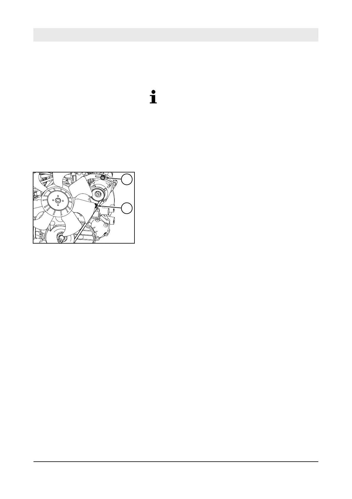 3. Loosen the tensioning screw (1) and screw (2) on the gener-