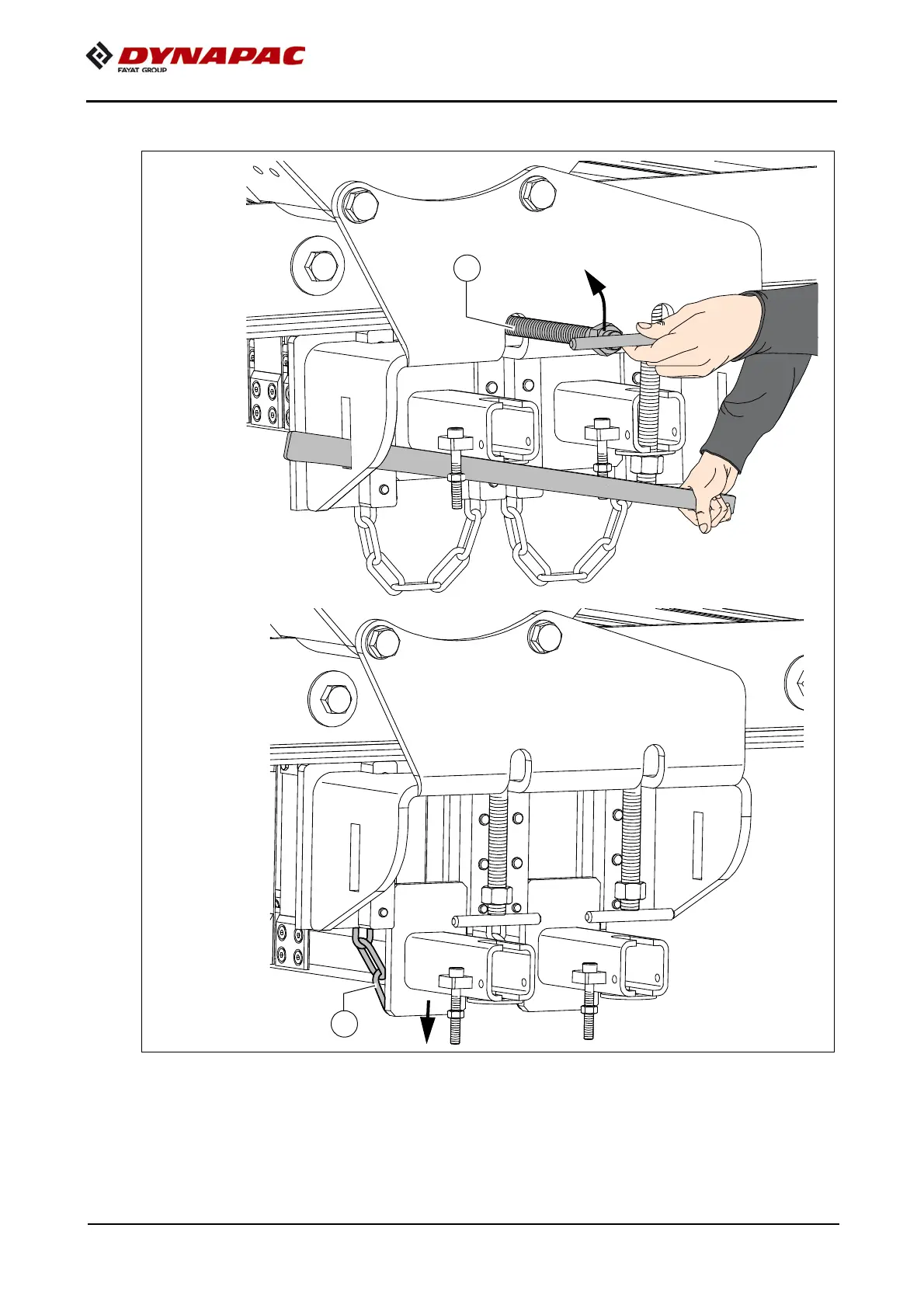 - Carefully set down scraper in chain (F).