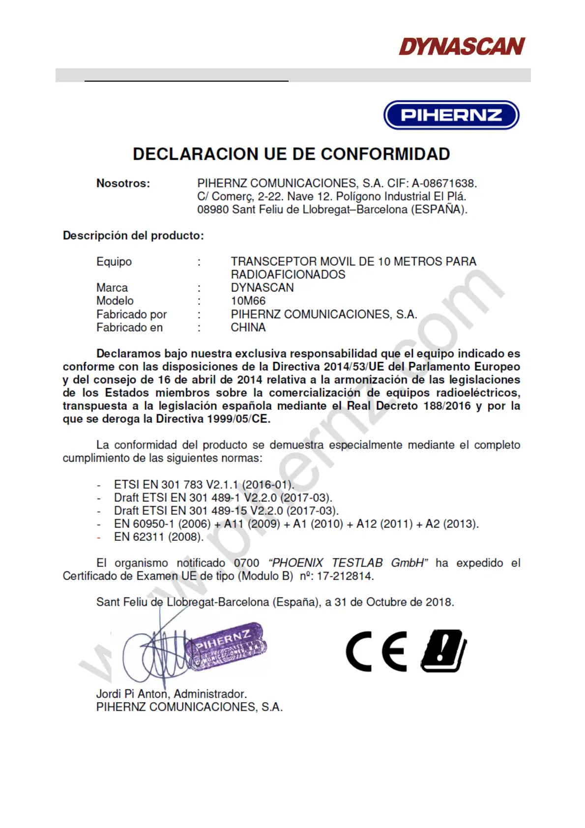 Dynascan 10M66 - Declaracion de Conformidad