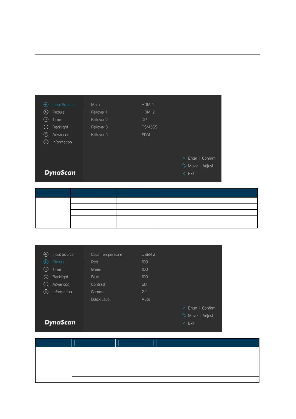 Press the MENU button on the built-in keypad or remote control to show the OSD. Use the