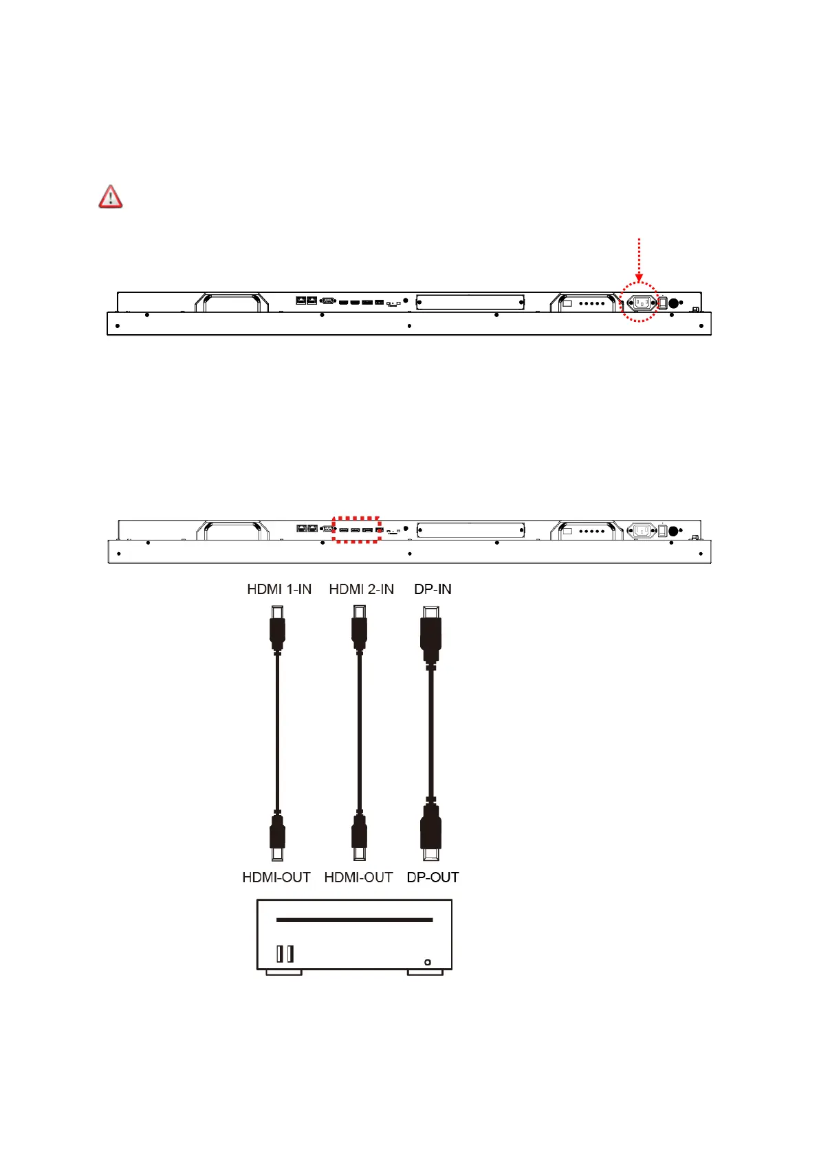 insert one end into the DP-IN (or HDMI 1-IN, HDMI 2-IN) which shown in the diagram below.