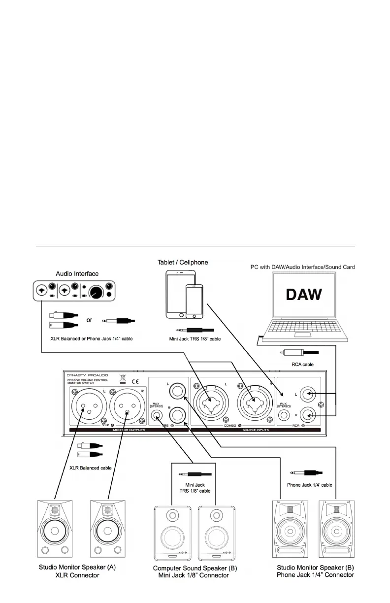 XLR (A): Use the XLR balanced cable to connect the inputs of powered studio monitors, or to a power