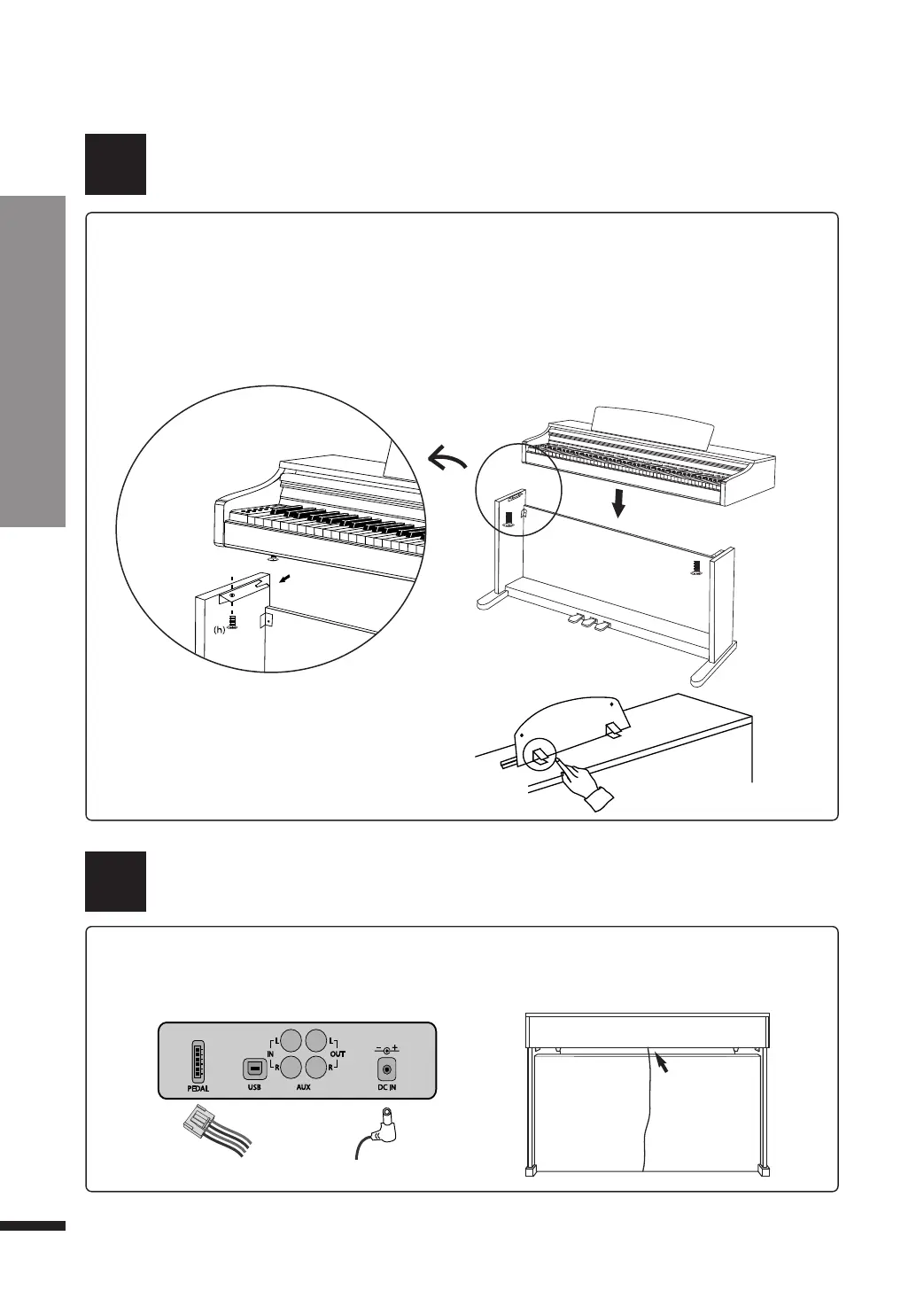 1 Connect the pedal cable from the pedals to the pedal jack beneath the main unit. The pedal
