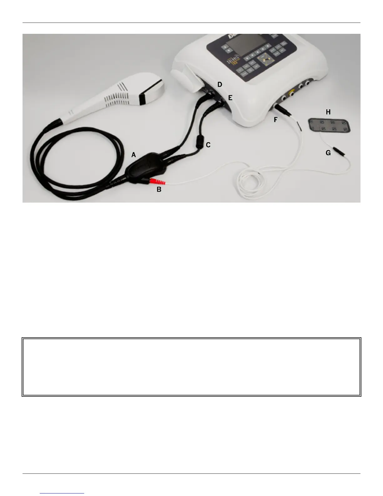 (A) “Y” Box (B) “Red” Banana Pin (C) Ferrite Bead (D) Light Pad Jack (E) Light Probe Jack (F) Stereo Plug (G) Combo Leadwire (H) Electrode