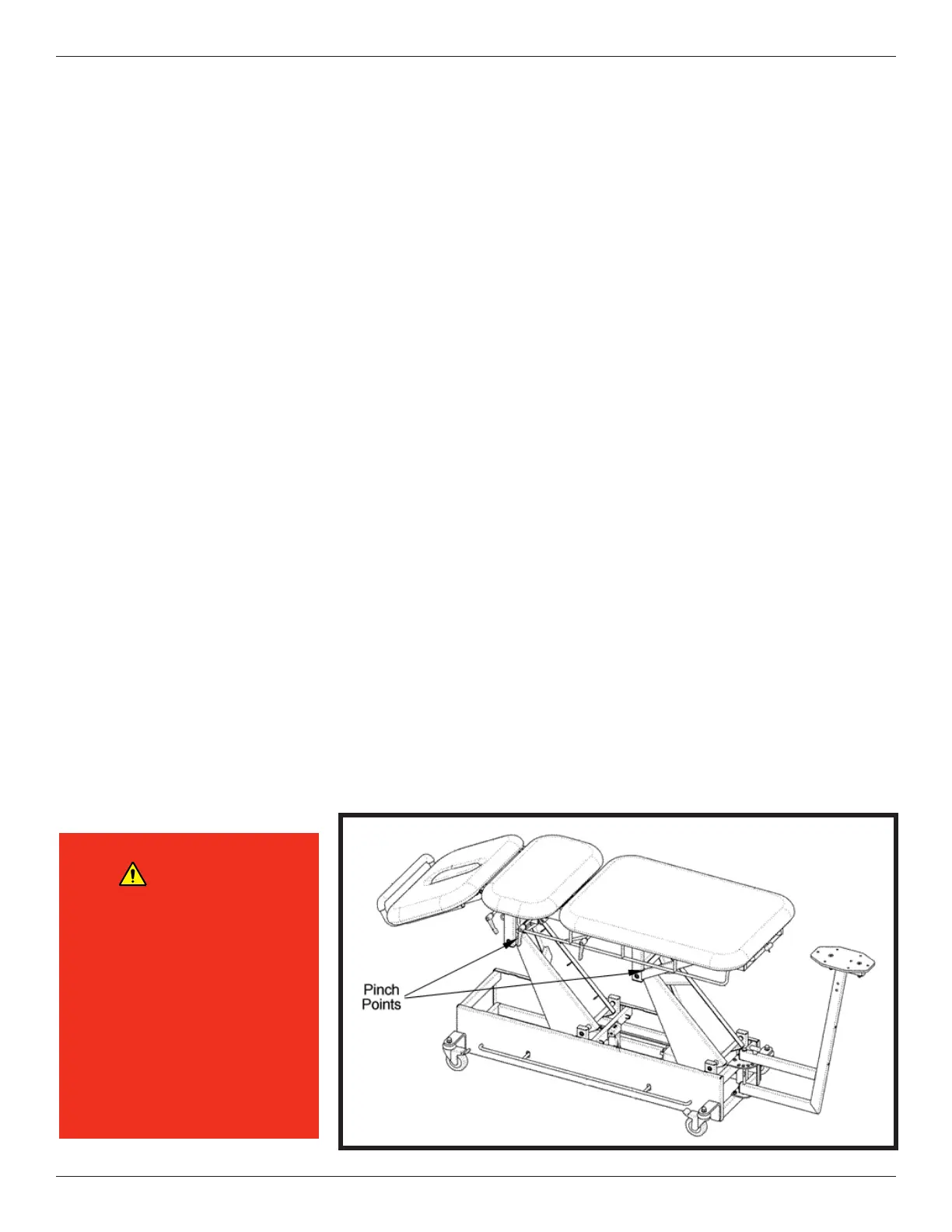 2. NEVER place hands or feet near moving mechanisms while raising or lowering the table.