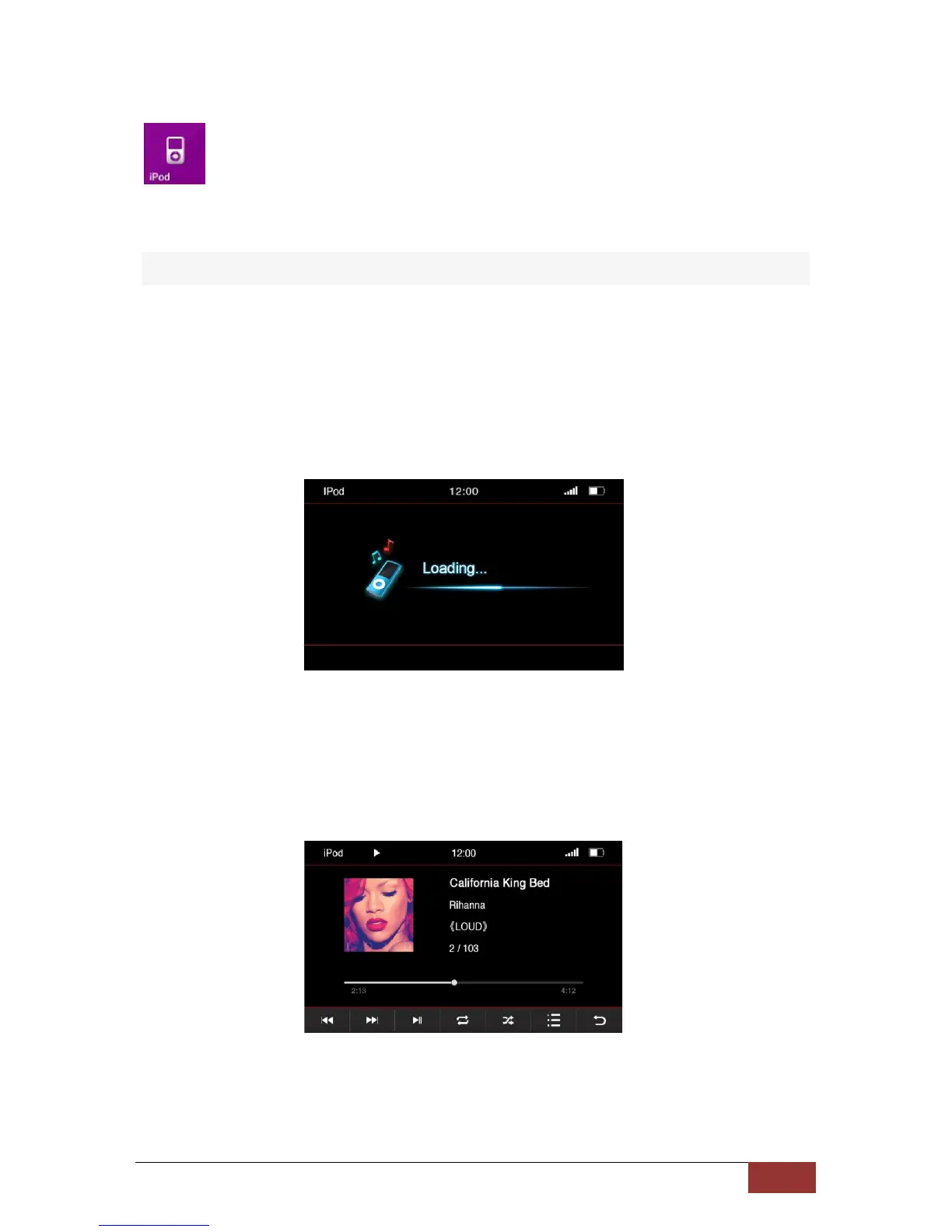After pressing the iPod button the home screen will open and the contents of the iPod® is charging.