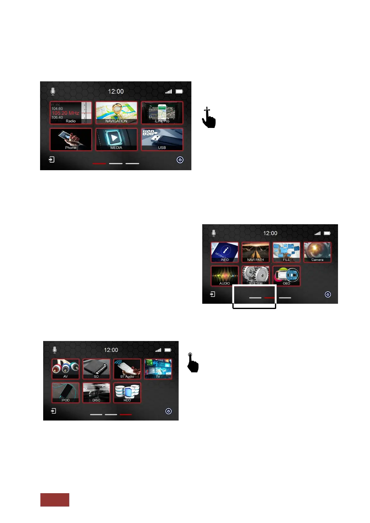 The main menu displays icons for various features/modes across three pages or sections. You can