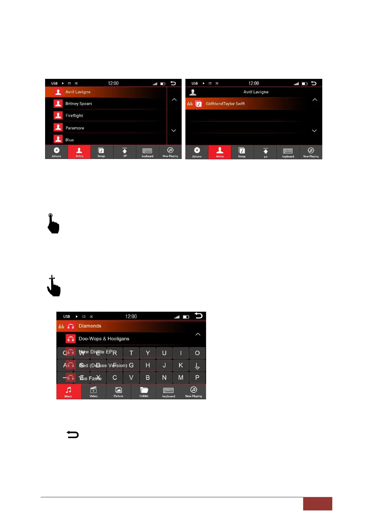 With an up and down motion, you can browse the songs, artists, albums in the displayed