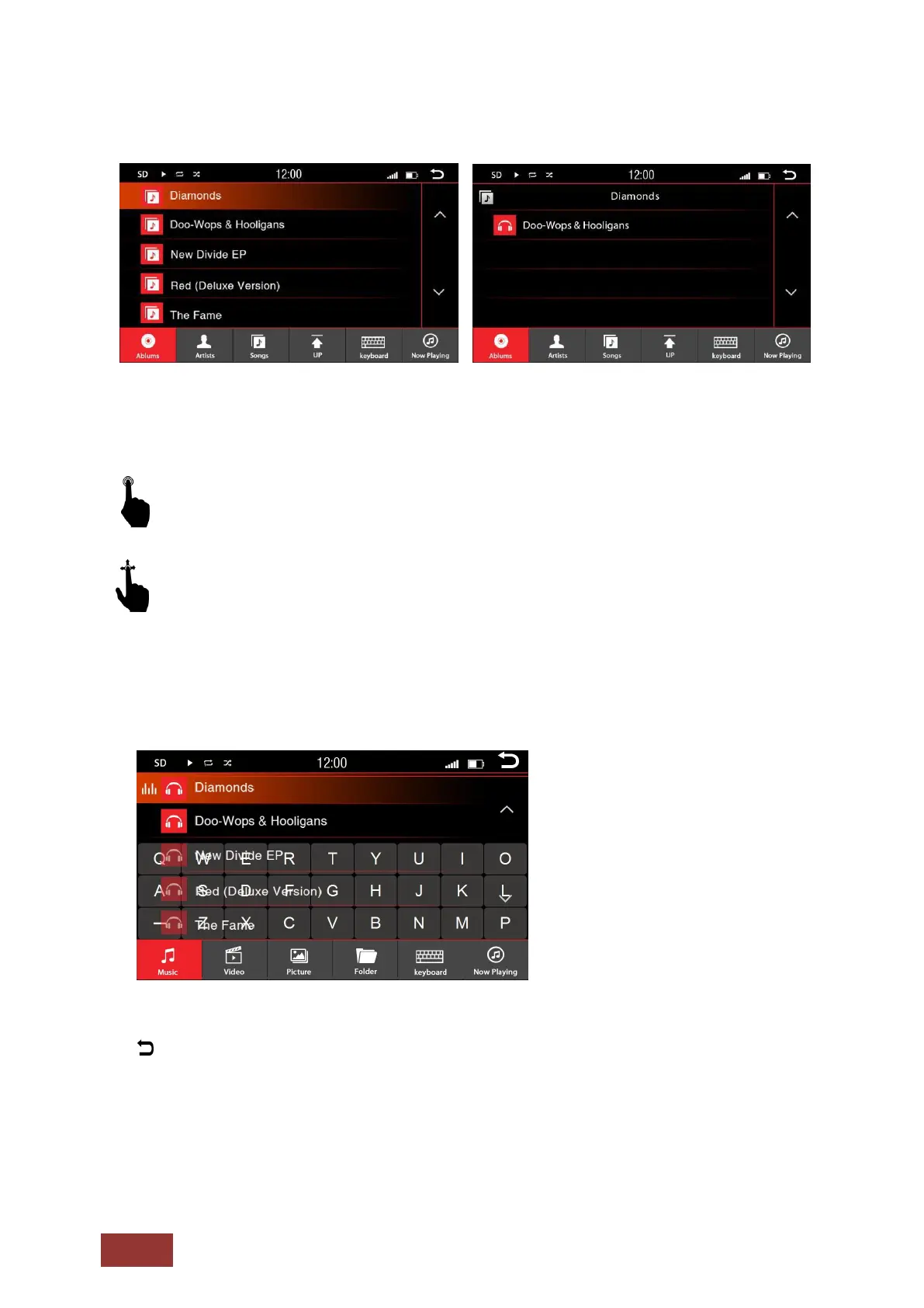 With an up and down motion, you can browse the songs or albums in the displayed section.