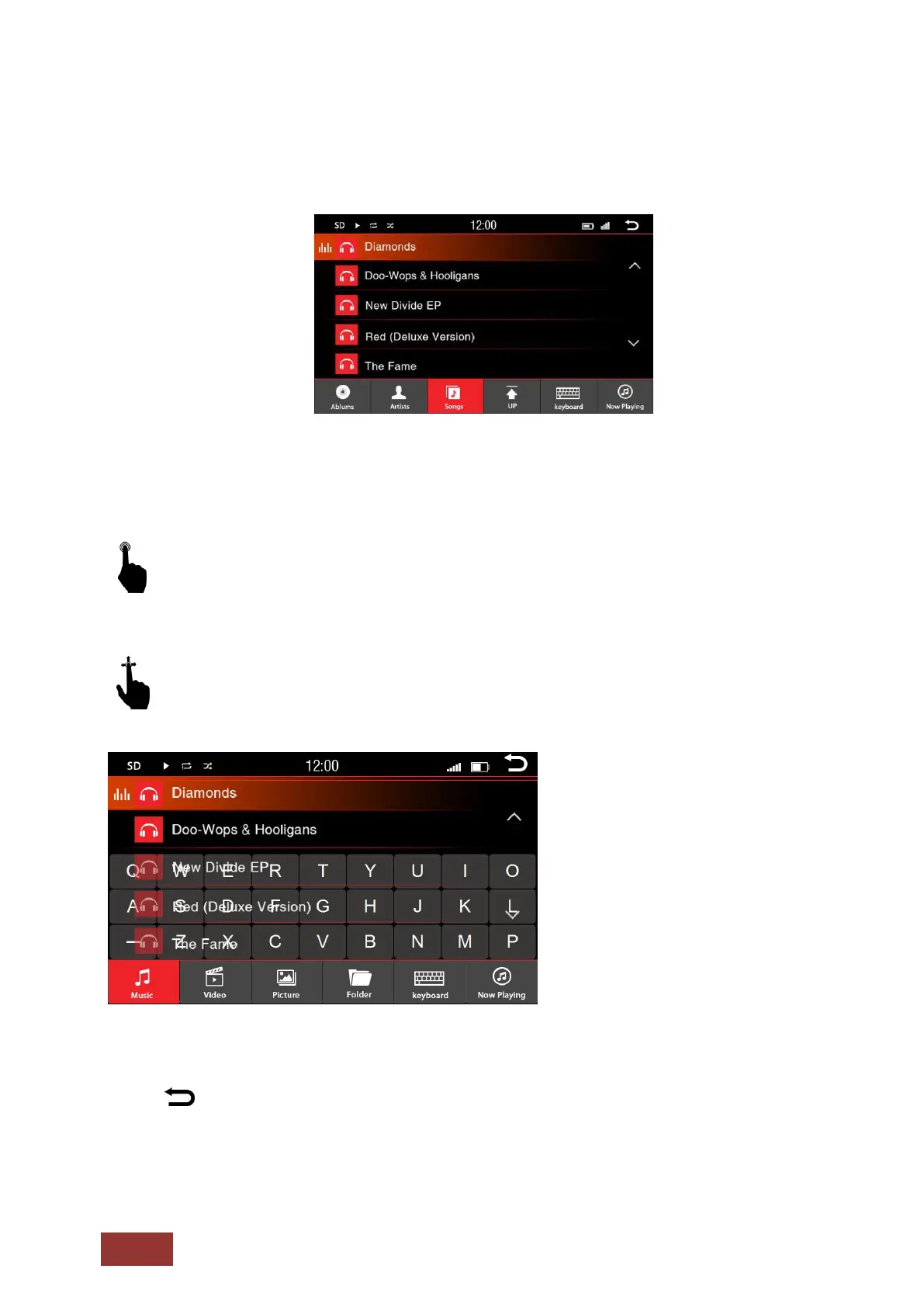 Short press on the title of a song to play it. An icon to the left side of the song title will show