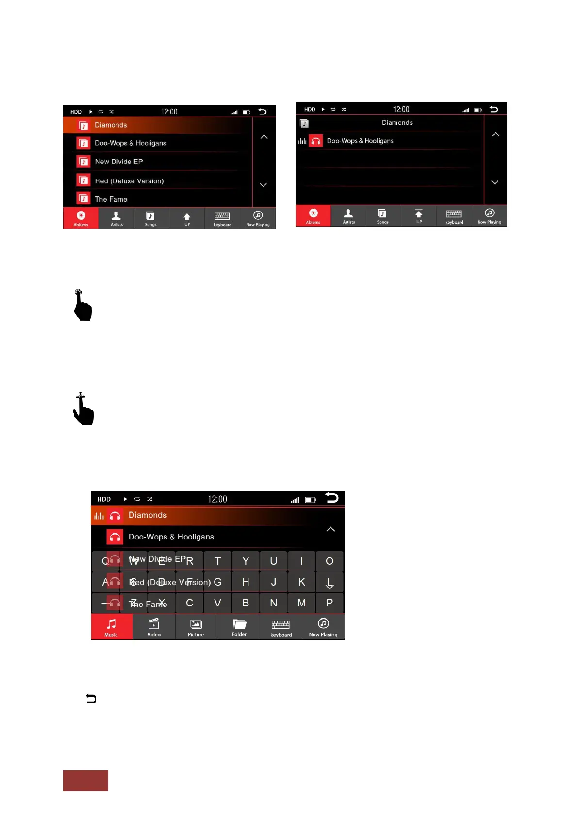 With an up and down motion, you can browse the songs or albums in the displayed section.