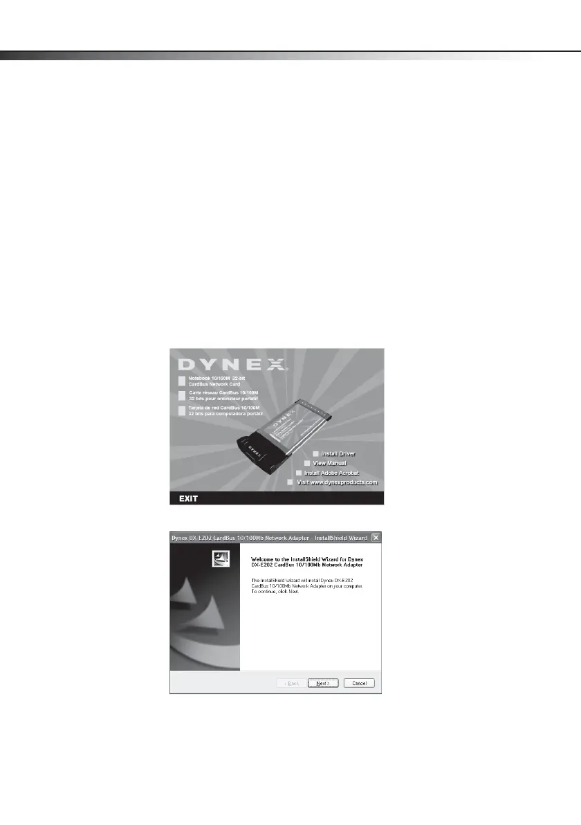 1 Insert the DX-E202 CD into your CD or DVD drive. The Dynex CardBus Network Card