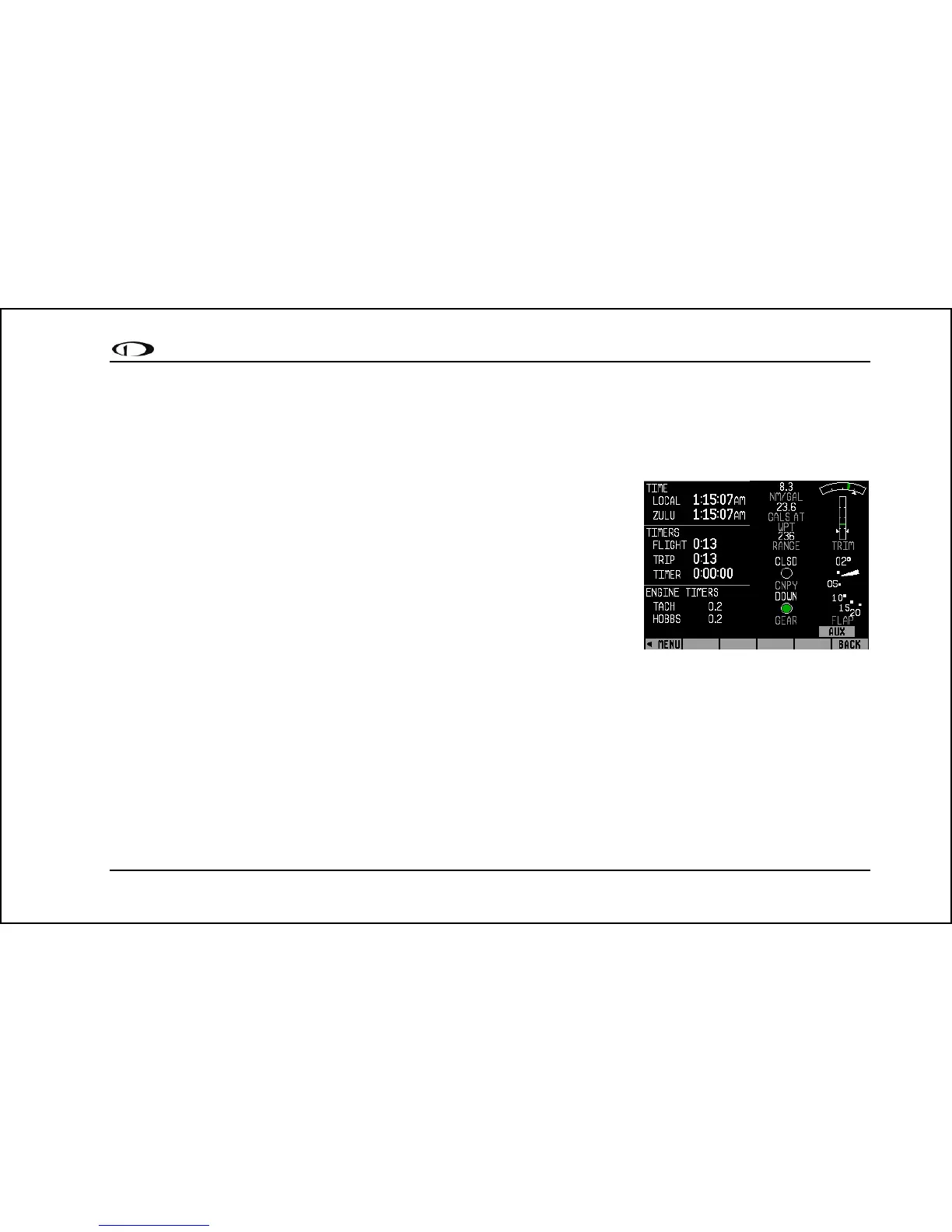 • The Flight Timer shows the total amount of time that oil pressure is above 15