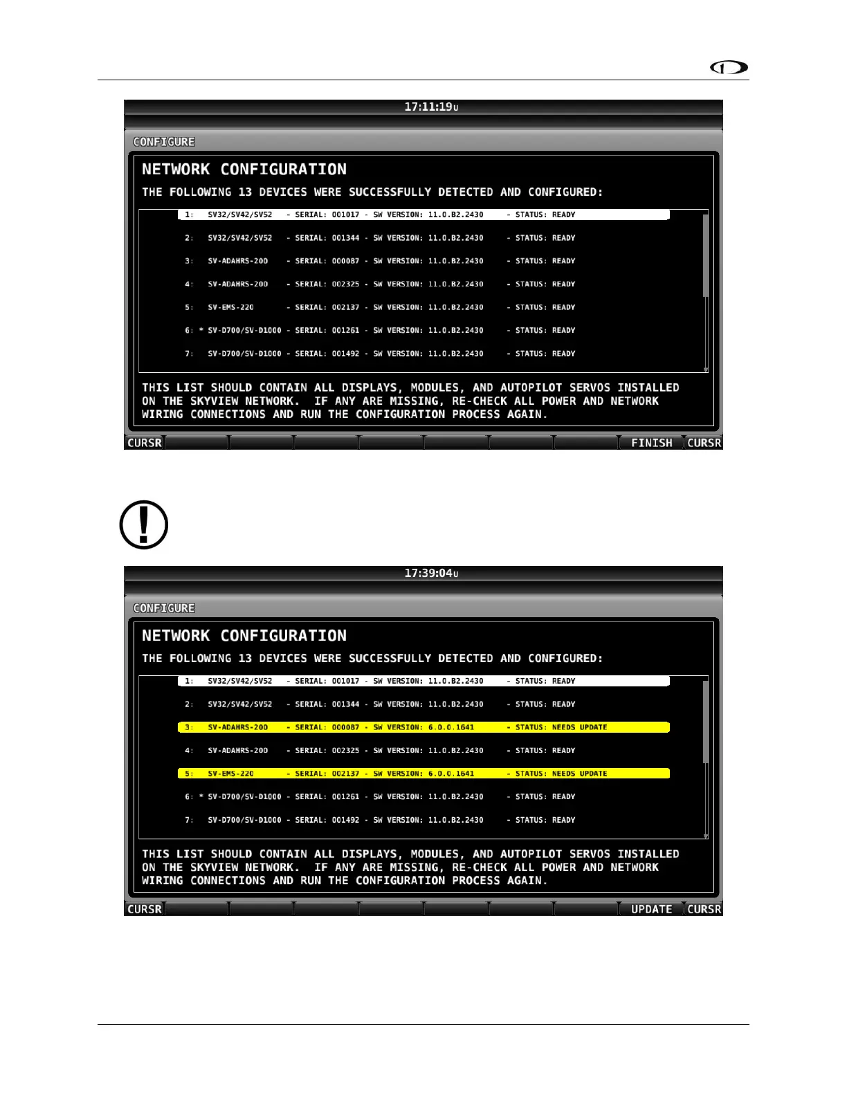 If the SkyView network is successfully configured, but Software versions on