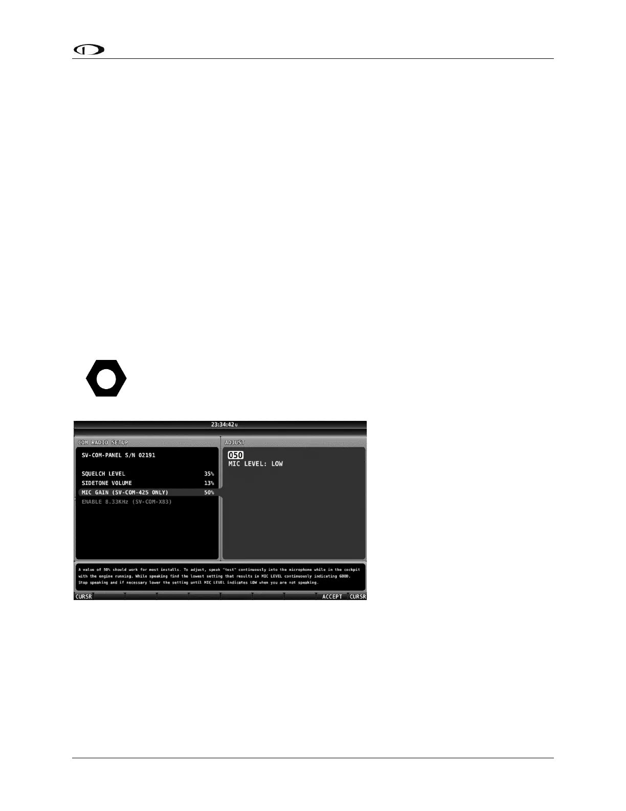 To adjust Squelch, Sidetone, and Microphone Gain, go to SETUP MENU > COM RADIO