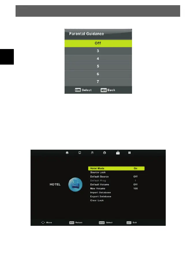 Press ▼/▲ button to select Parental Guidance, then press Enter button to enter sub-menu