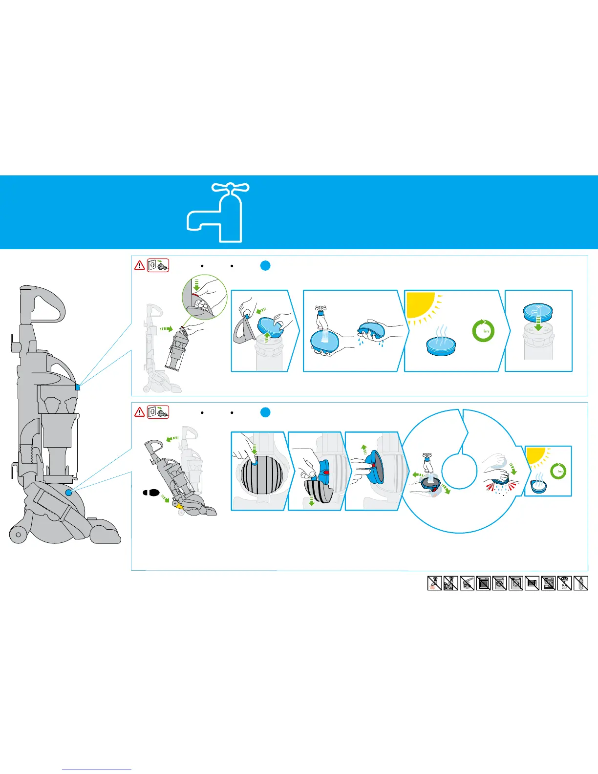 Sie den Filter unter fließendem Wasser aus. Drehen Sie den Filter um und klopfen Sie ihn gründlich aus, um die Kohlestaubemissionen des Motors zu entfernen.