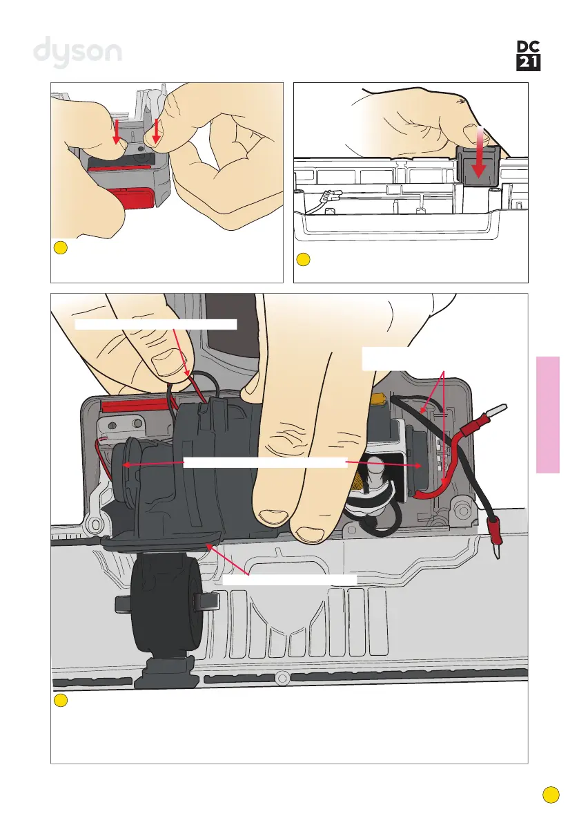 Ensure the brushbar motor wires are looped under the motor brushes. Important: hold the