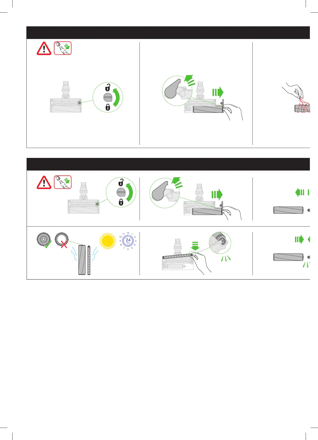 Clearing brush bar obstructions. Enlever les obstructions dans la brosse. Reinigung der Bürstwalze. Borstelverstoppingen verwijderen.