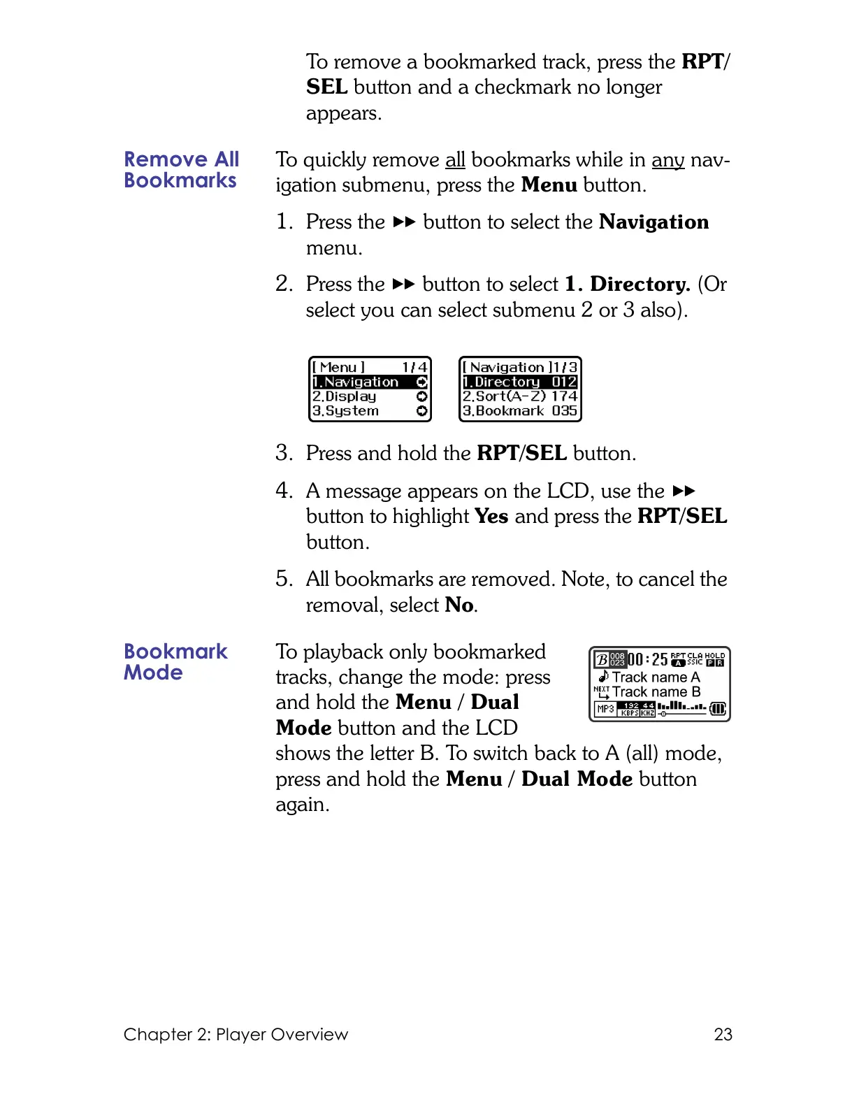 To remove a bookmarked track, press the RPT/