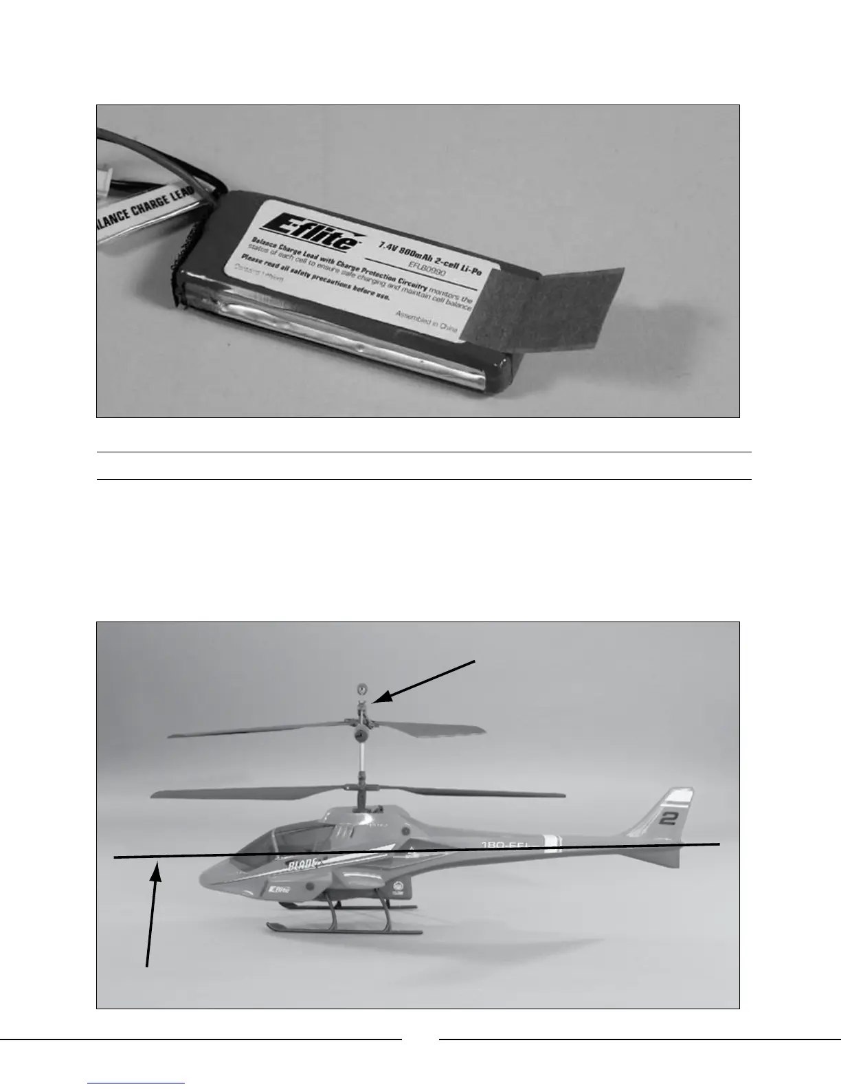 the tail section of the body. Make sure that the helicopter balances level. If it does not, confirm that the battery has