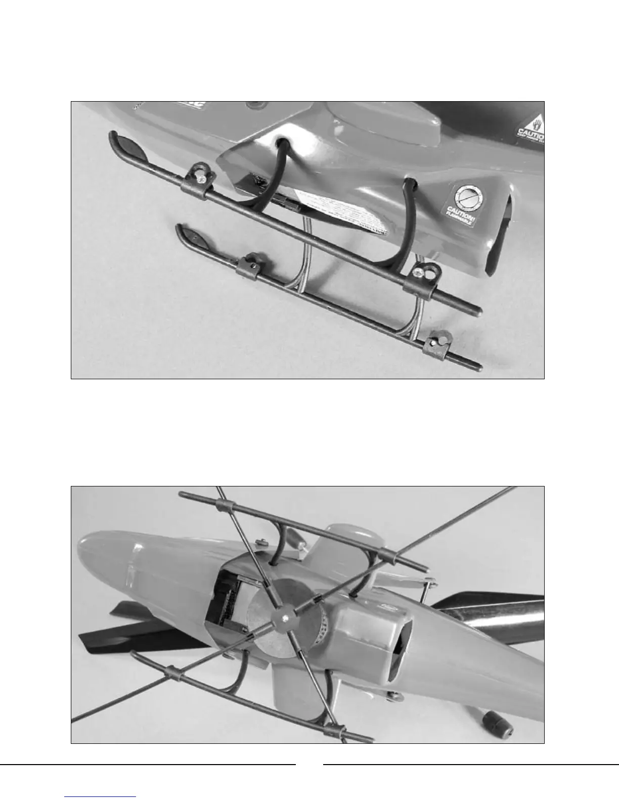 • Carefully pass each of the rods through the attachments on the landing skids and into the channels on the base.