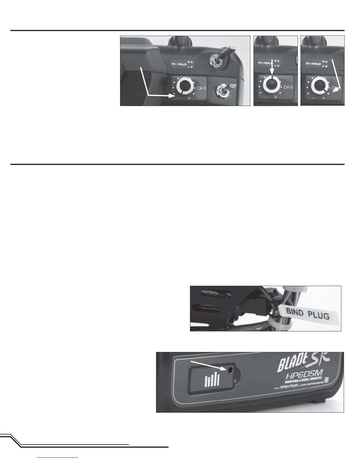 • When you connect the fl ight battery to the 2-in-1 unit with the bind plug connected to the battery channel pins on the receiver, you will