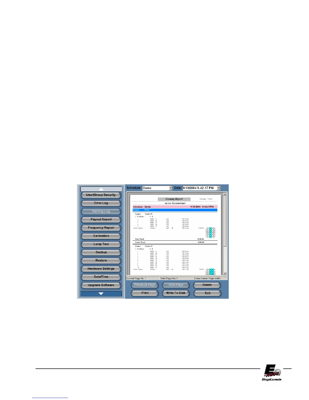 The E-max™ Bingo Console keeps a gaming report of all games played, faces verified, Ball Tray Activity