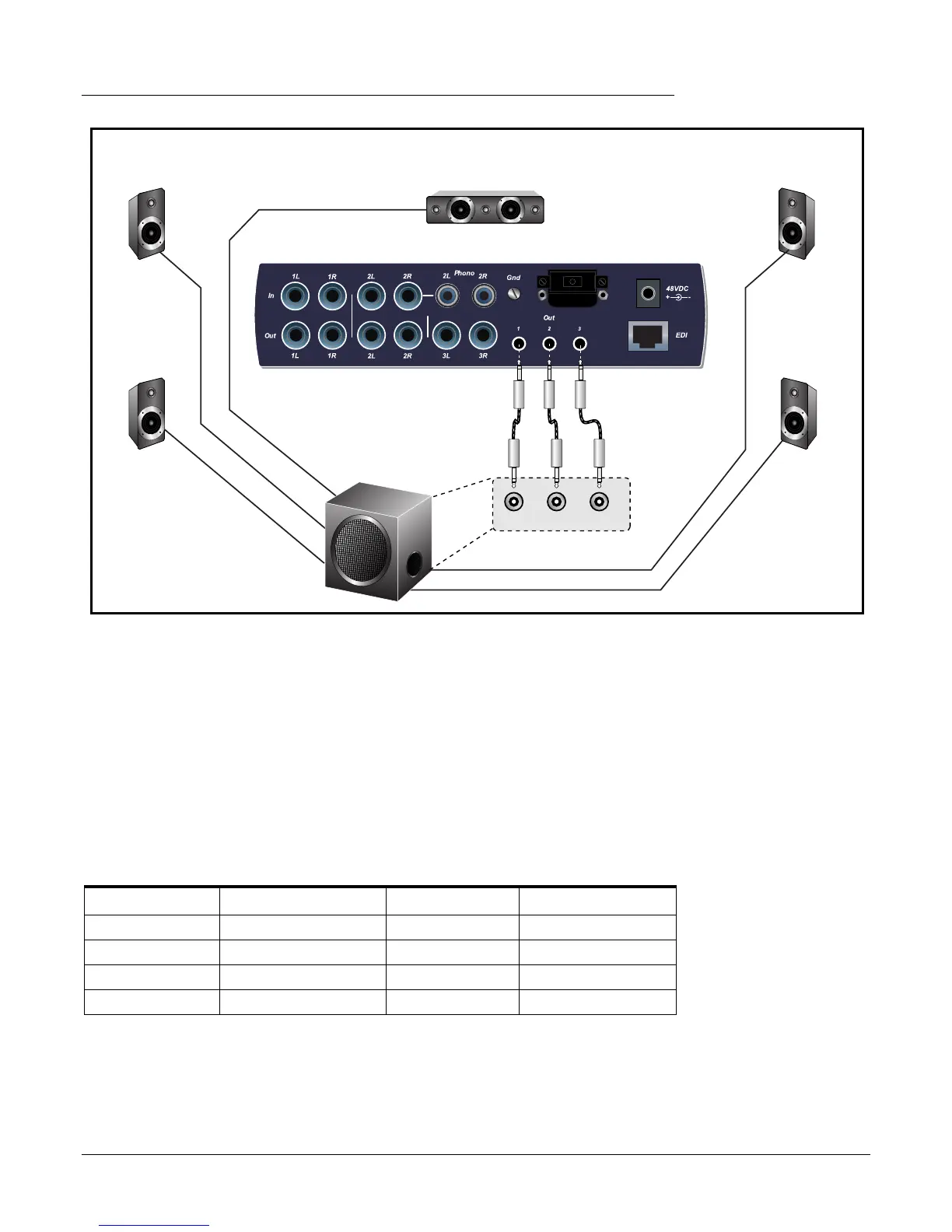 The chart below shows how to connect the outputs for 5.1 surround sound playback.