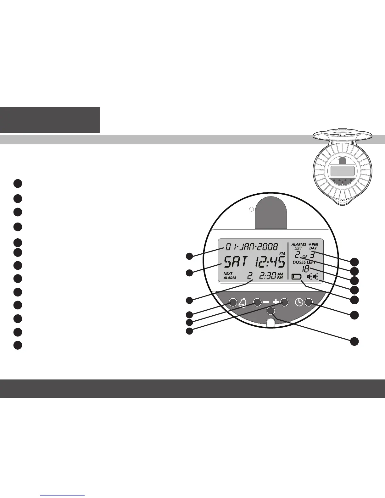 Next Alarm/Time Displays reminder time for the next dose to be