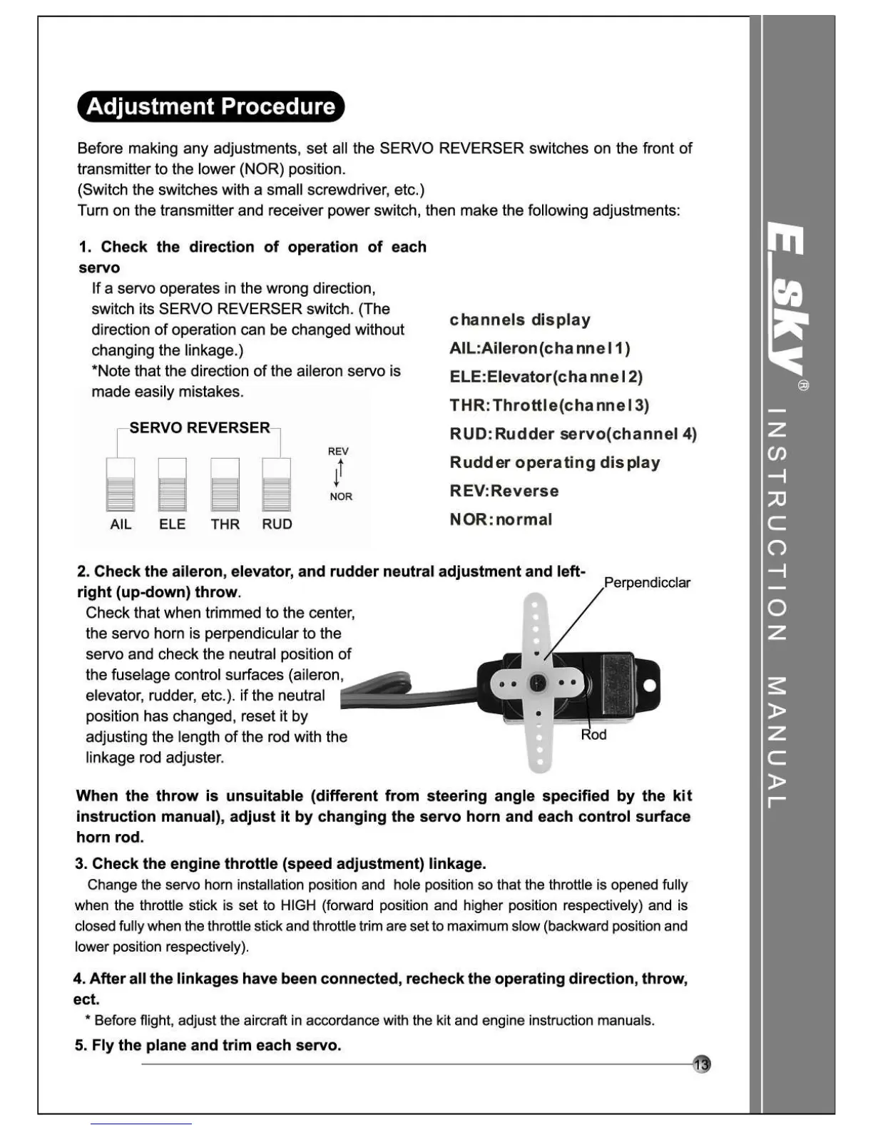 E sky EK2-0404 - Adjustment Procedure; Servo Operation Check and Reversal; Neutral Adjustment and Linkage; Throttle Linkage and Final Checks
