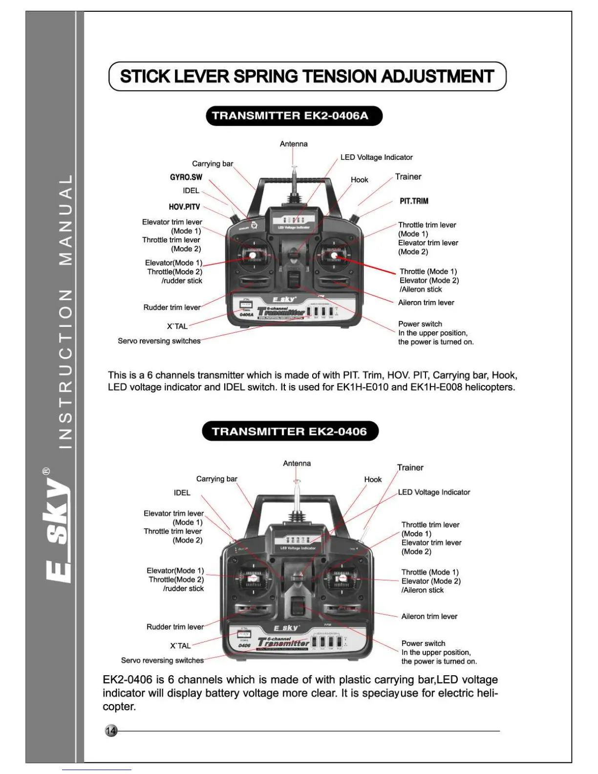 E sky EK2-0404 - Stick Lever Spring Tension Adjustment; Transmitter EK2-0406 A and EK2-0406 Overview