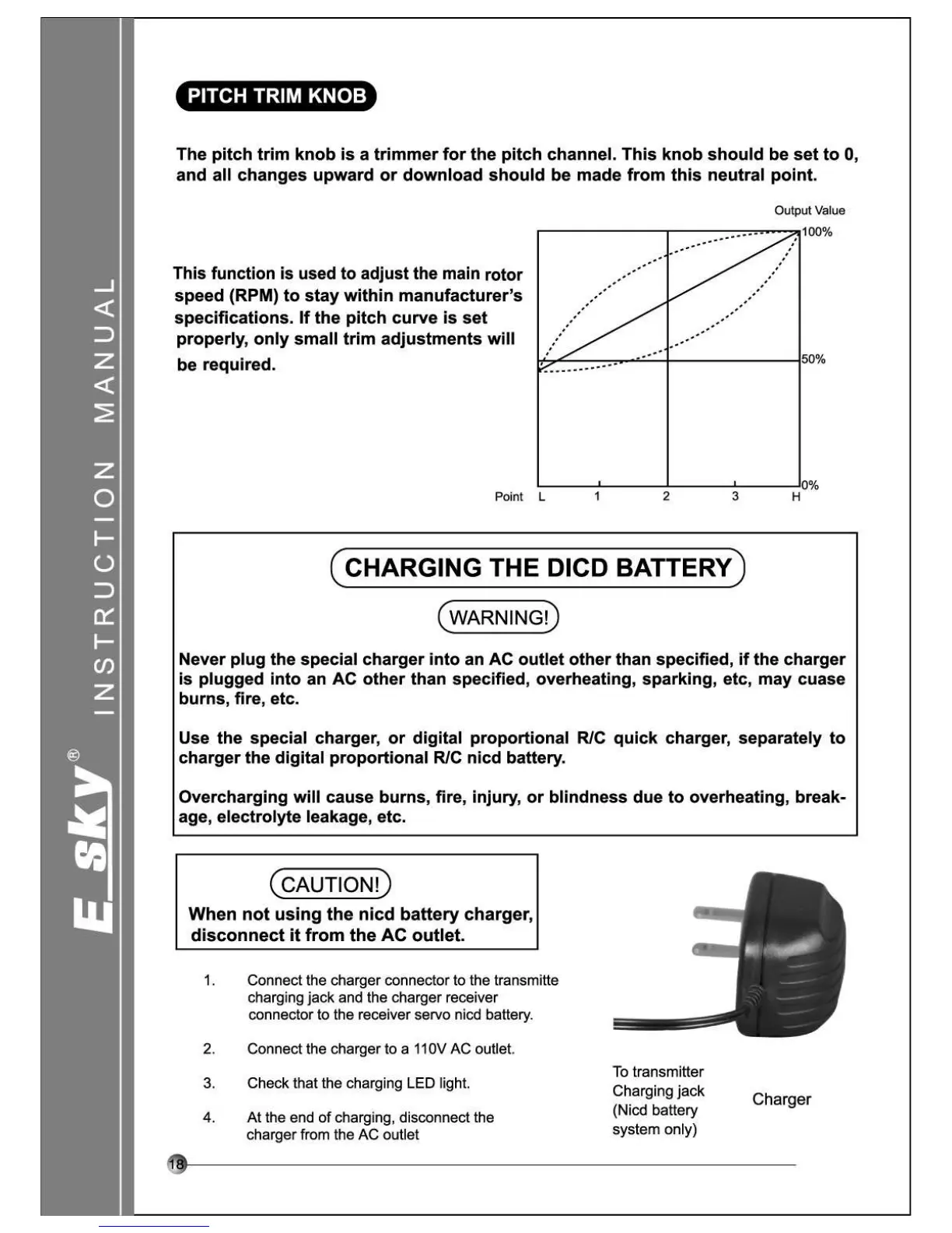 E sky EK2-0404 - Pitch Trim Knob; Main Rotor Speed Adjustment; Charging the NiCd Battery; Important Charging Warnings