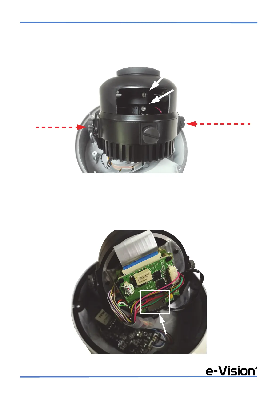 Allentare le viti di fissaggio indicate dalle frecce tratteggiate nell’immagine dello step 2 e inclinare il corpo della telecamera