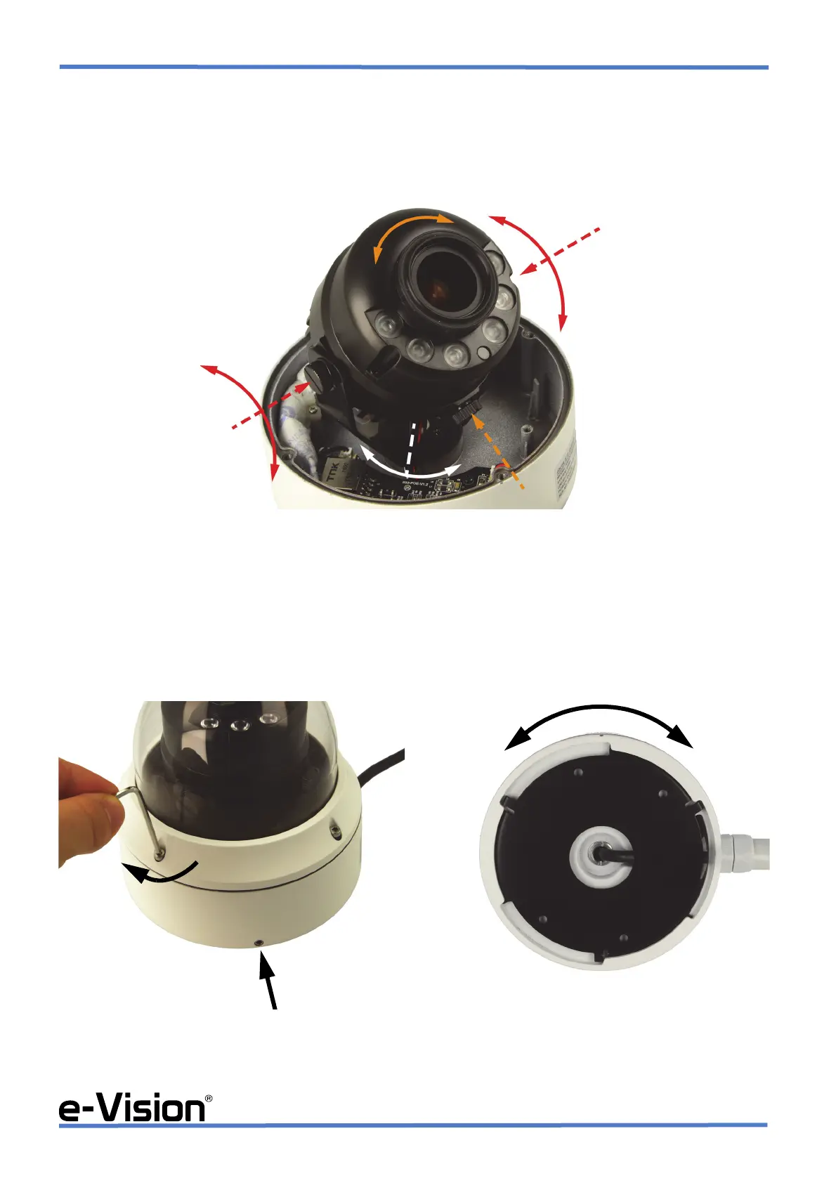Effettuare le regolazioni dei tre assi della telecamera agendo sul corpo della stessa come indicato dalla frecce curve.