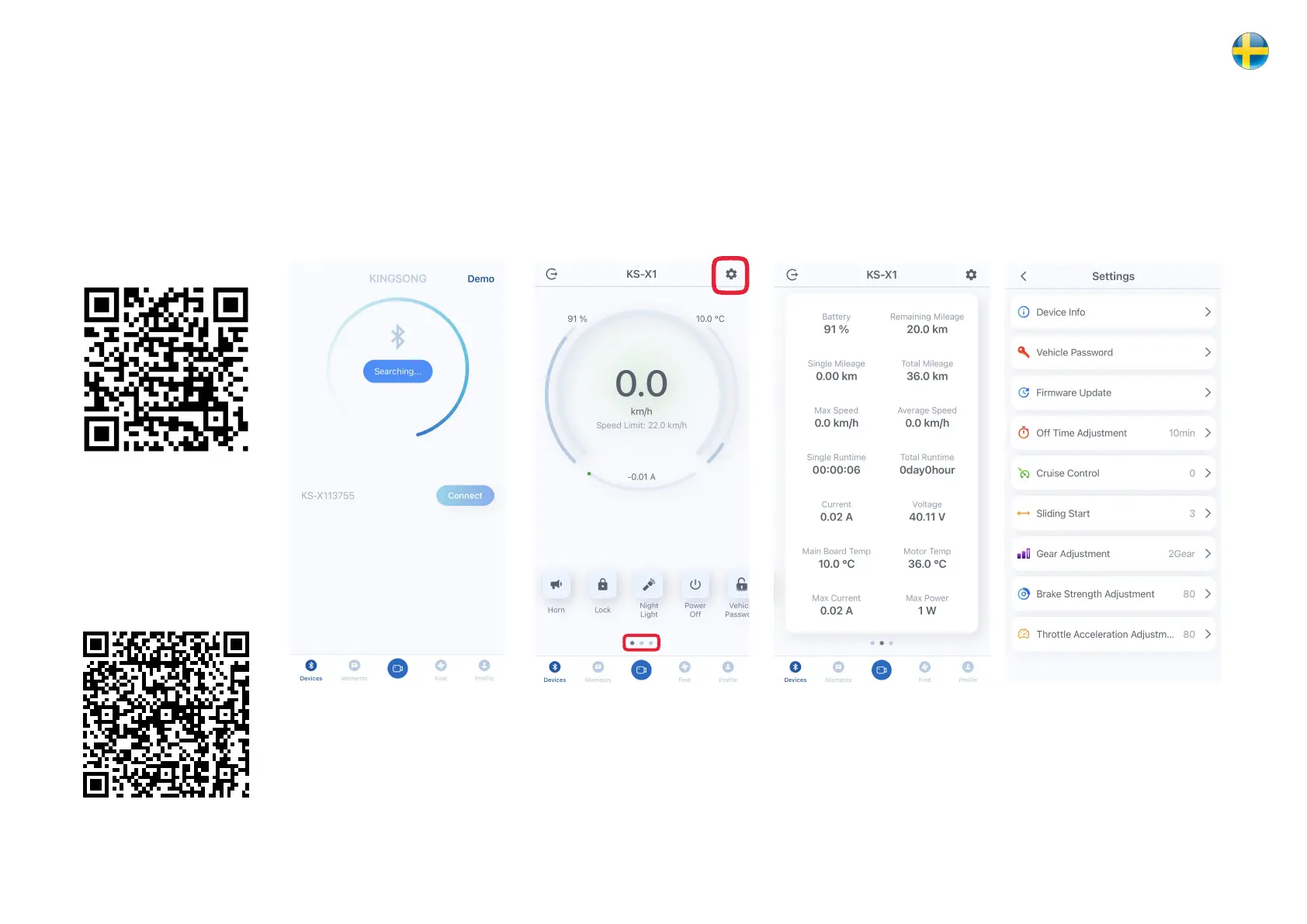 sparkcykel hittar du under namnet "KingSong" i både Appstore och Google Play. Du kan använda QR-koden nedan till vänster för