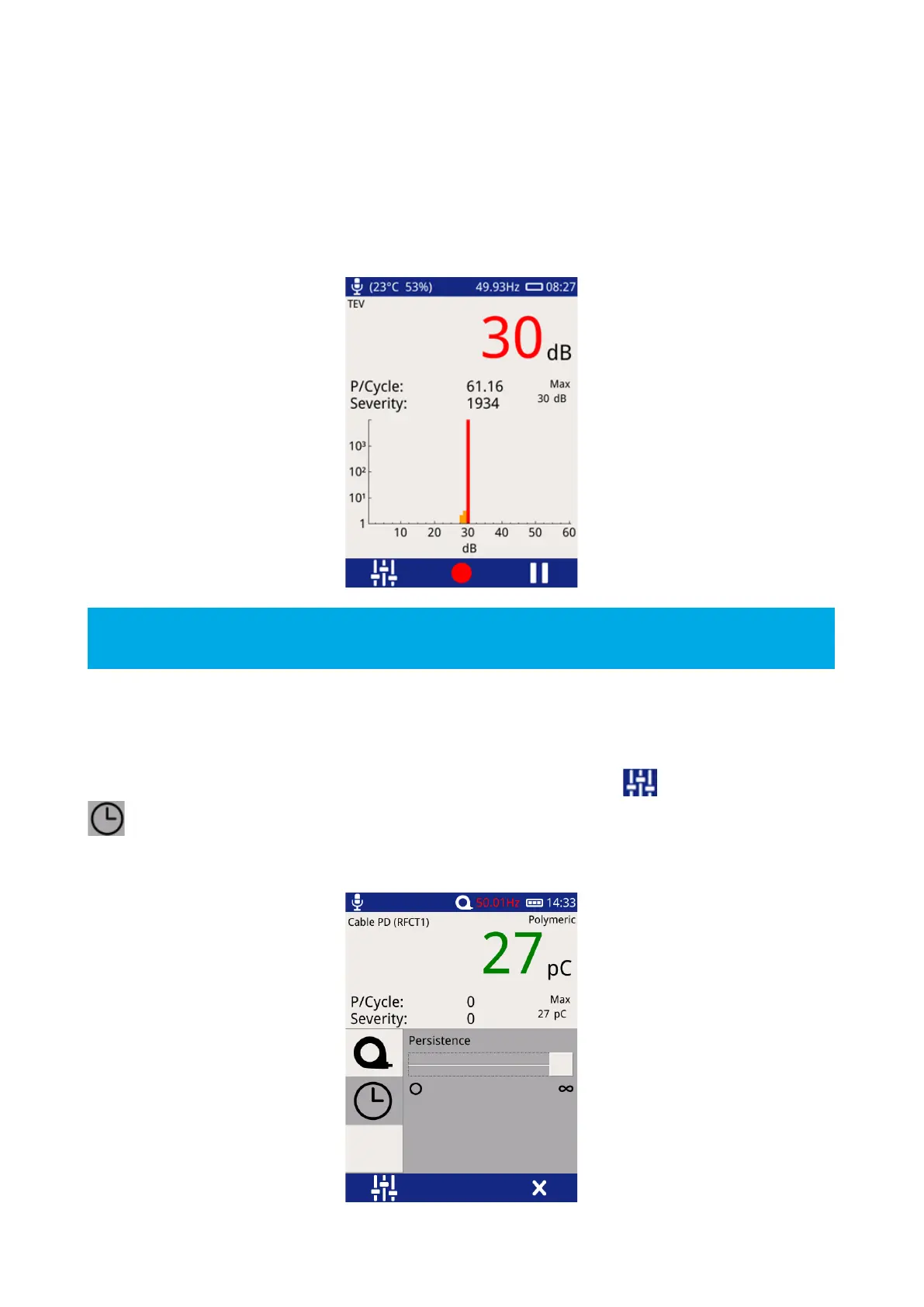 The Persistence mode is available in the Phase Plot and Amplitude Histogram screens for TEV, Cable PD and