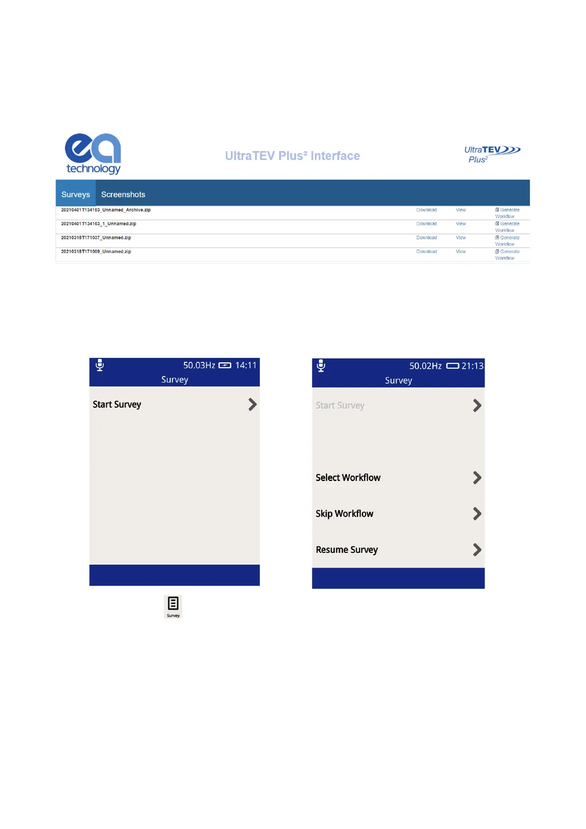 To start a survey, press ‘Start Survey’ on the display. Doing this will show two options to select from; Select
