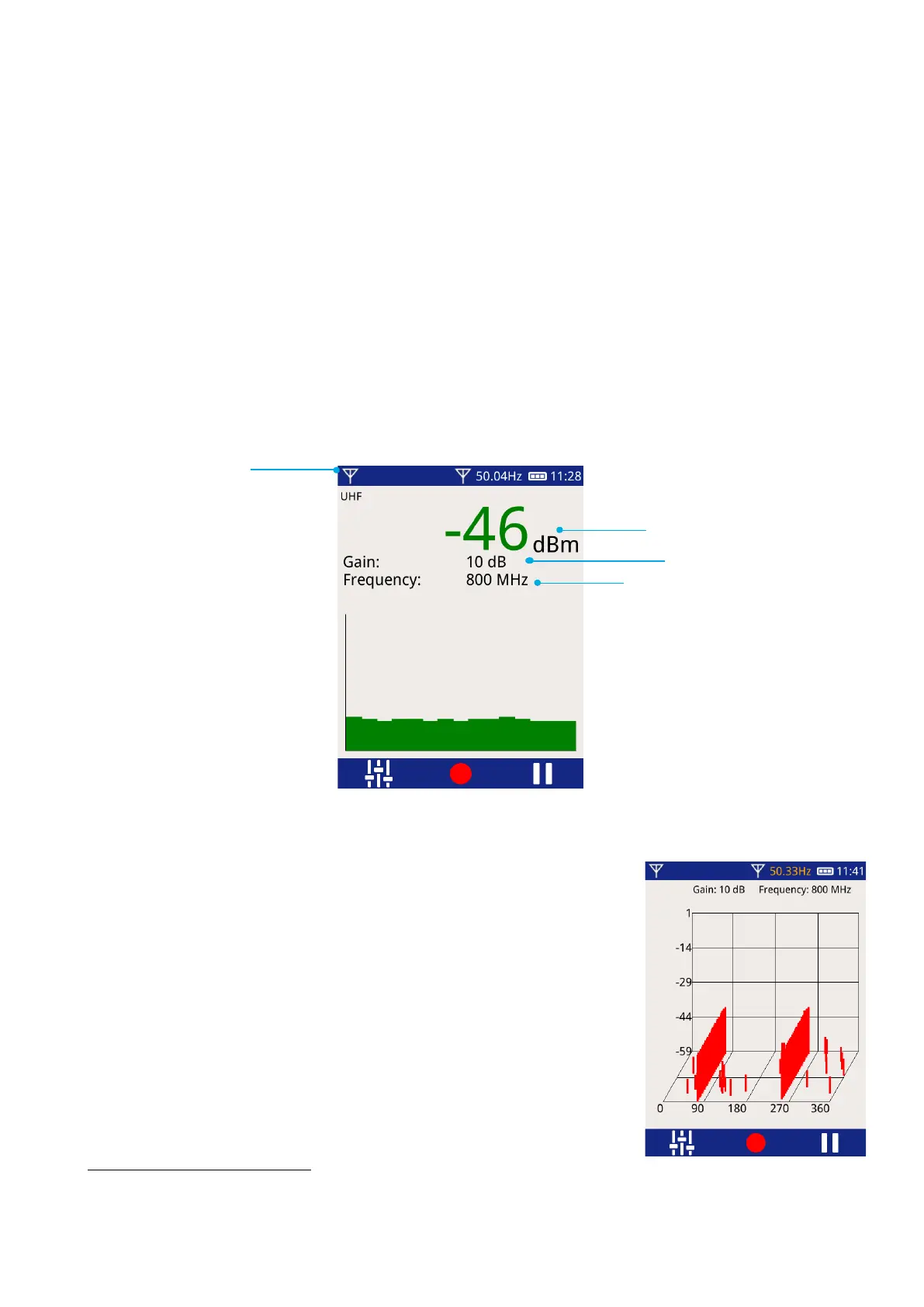 • The selected gain and tuning frequency are displayed (in Narrowband mode only)