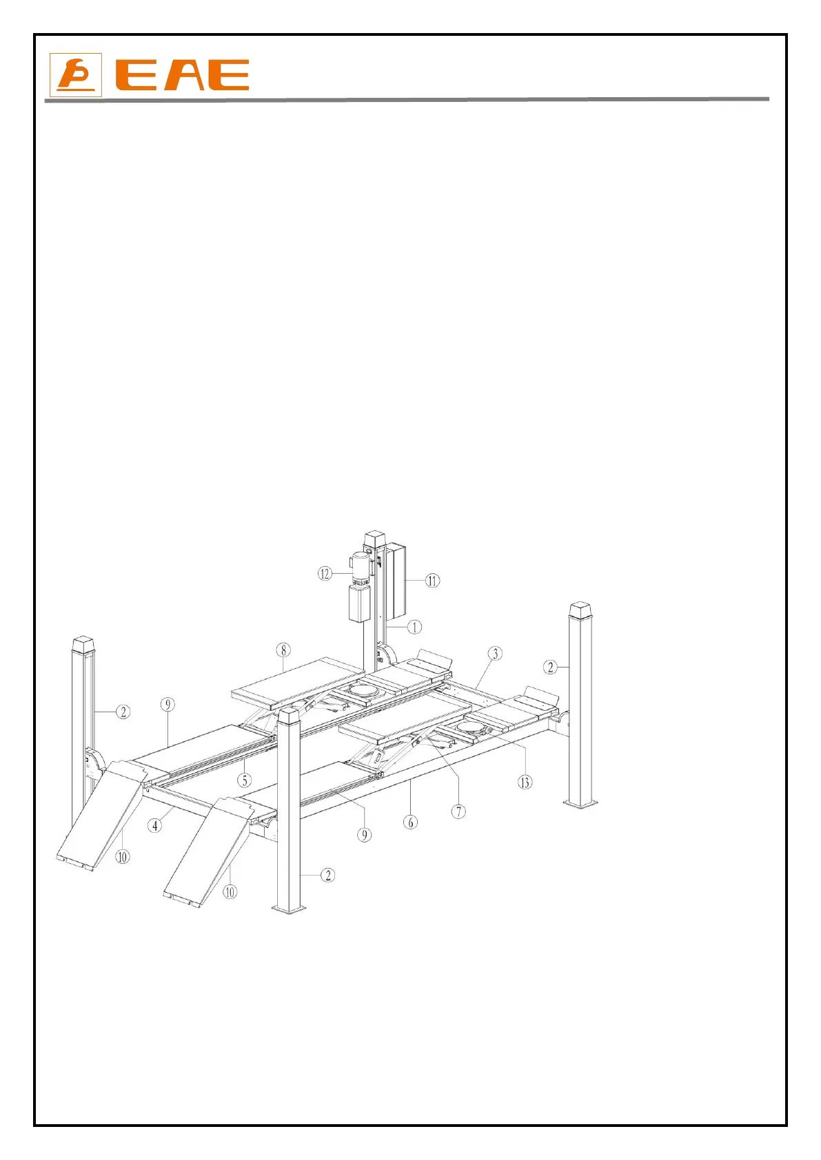 the secondary lift 8. The secondary platform of the secondary lift 9. Side slip 10. Drive-on ramps 11. Control box 12.Power unit 13.Turntabl