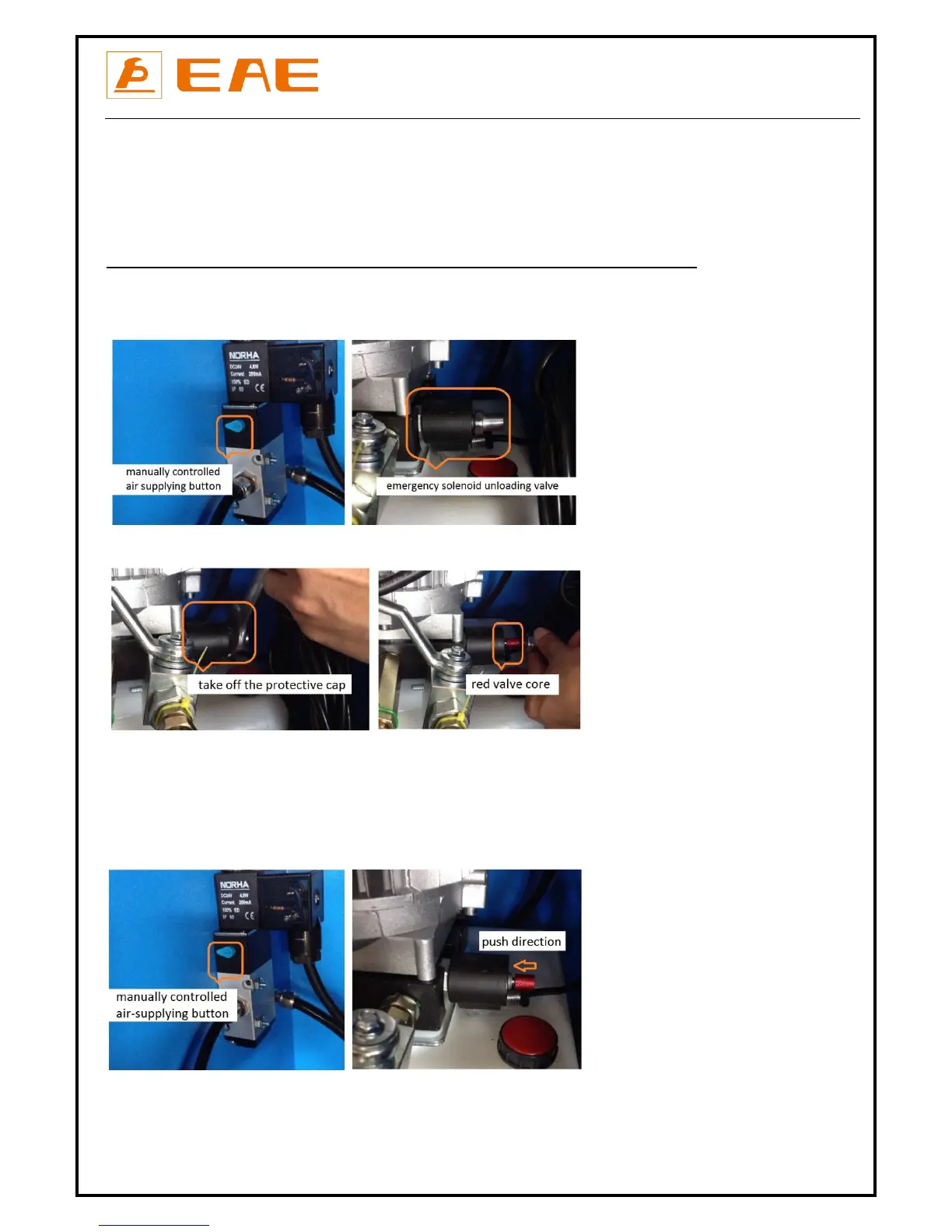 1. Open the control cabinet and find out the manually controlled air-supplying button and emergency unloading solenoid valve.