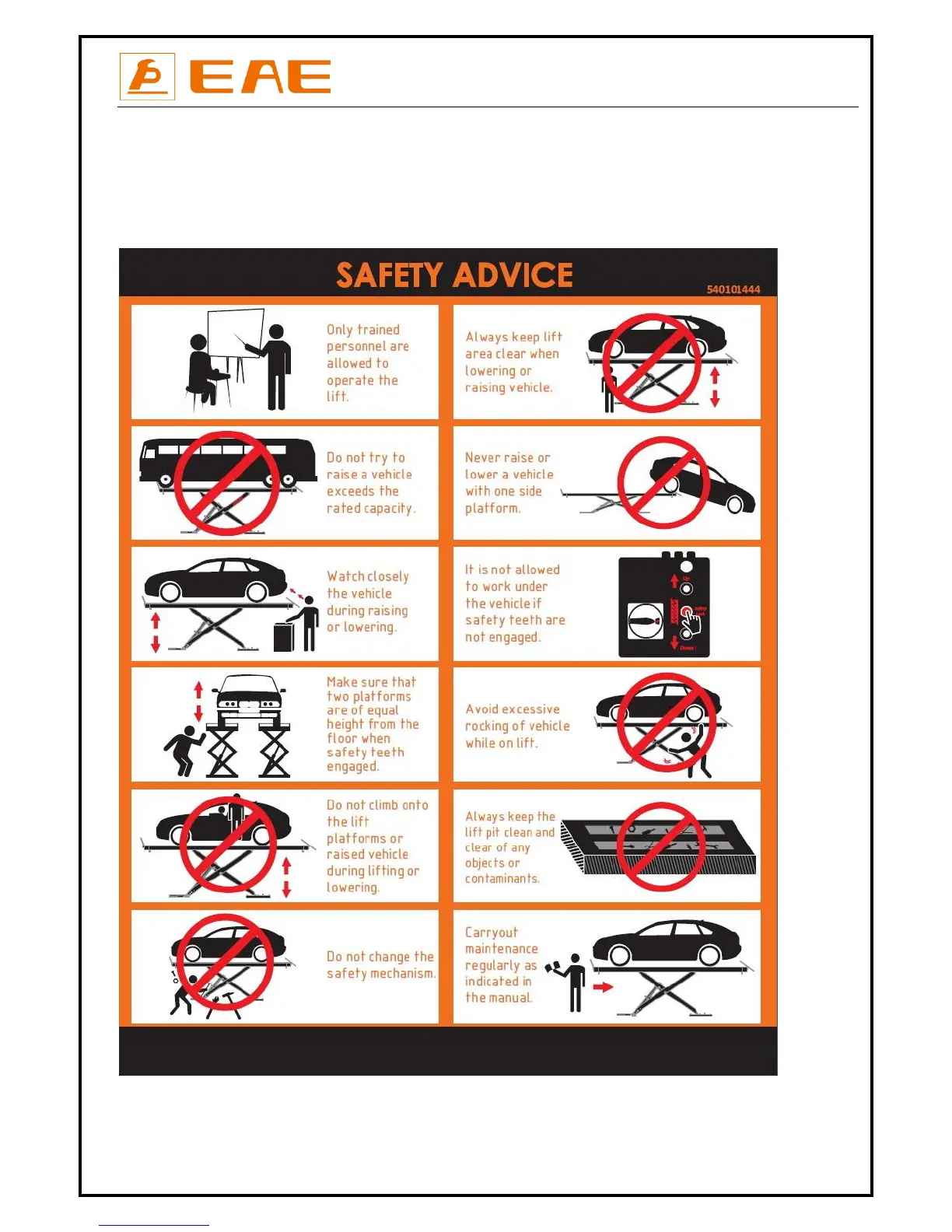All safety warning labels are clearly depicted on the lift to ensure that the operator is aware of and avoid the dangers of using the lift in