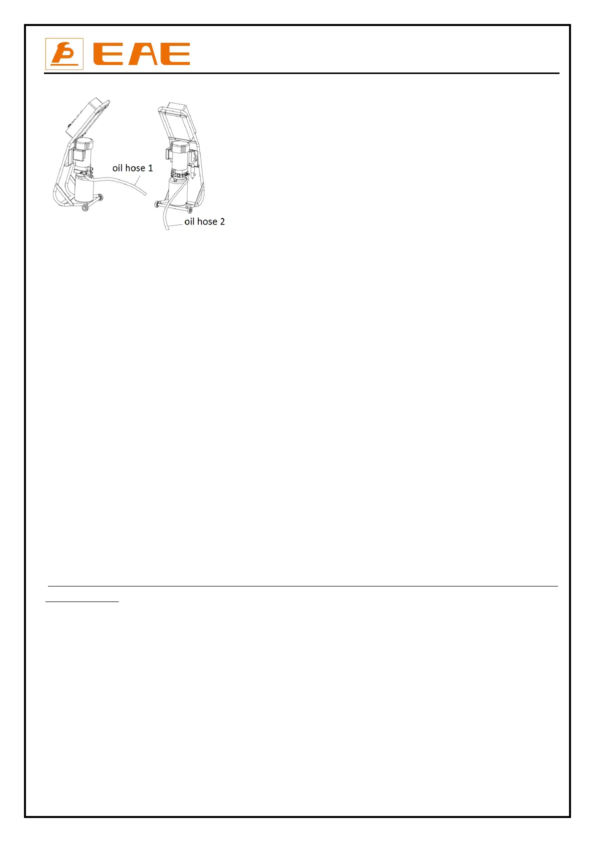 Pour 5 liters of hydraulic oil into the oil tank. The level of oil shall reach the tippets volume mark of the tank.
