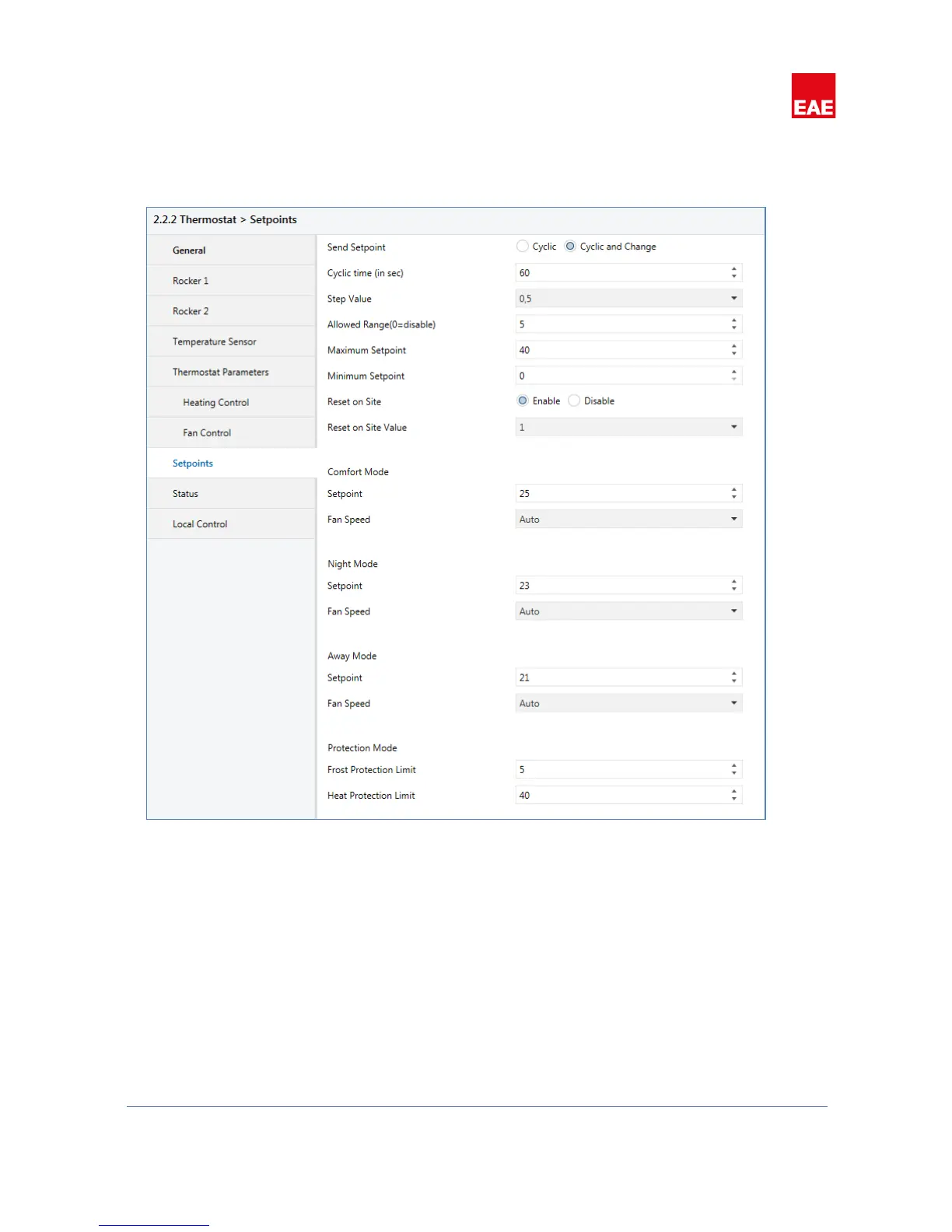 Setpoints, setpoint limitations, fan speeds and reset on site operations controlled through this parameter tab.