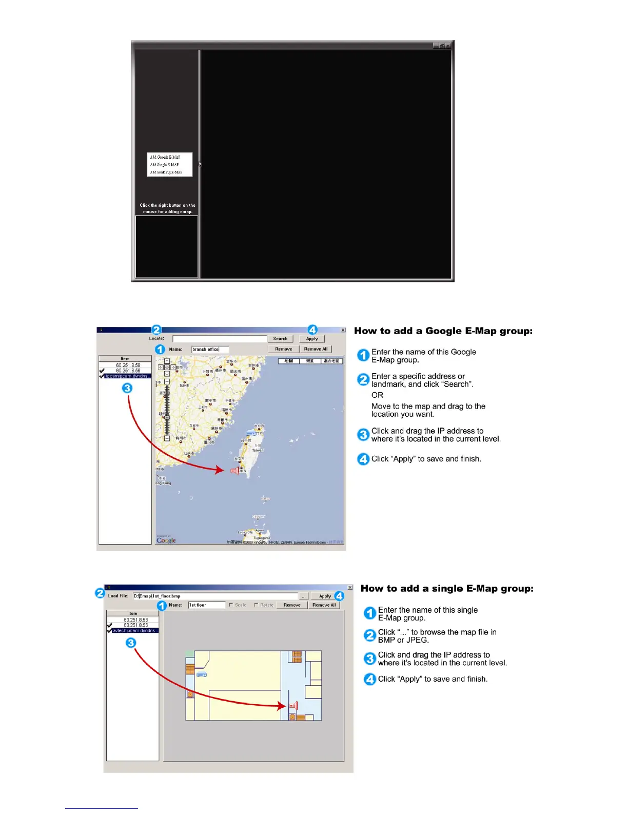 There are three E-Map groups you can add: Google E-MAP, Single E-MAP, and Building E-MAP.